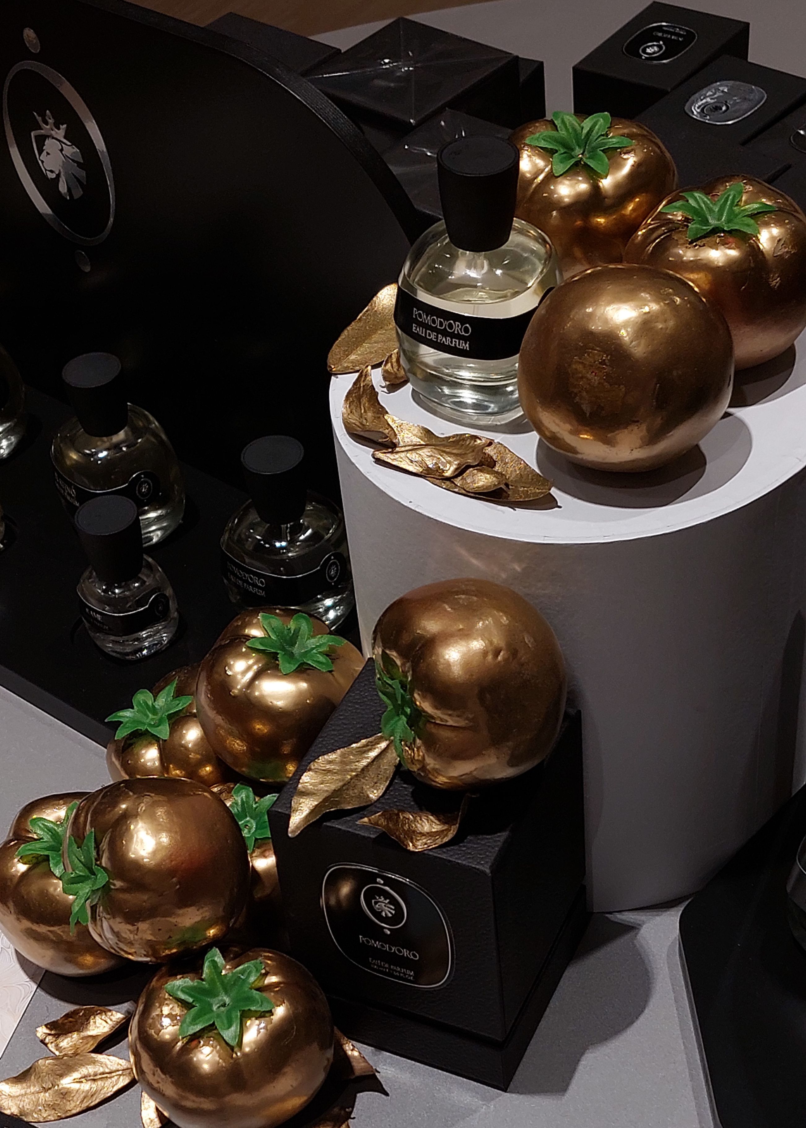 Pomod'ORO mohl být čistě naturalistický – miniskleník pro sazenice na okenním parapetu, malá, ale mohutná liliputánská zahrádka, která nevyžaduje opuštění bytu. Ale éterické kosatce a hyacinty pokrývají Pomod'ORO beztížnou vrstvou pudru, zdůrazňují jeho zeleno-květinovou jemnost a propůjčují kompozici eleganci. Dala by se označit za lineární vůni: po zářivém lékořicovo-rajčatovém úvodu se kompozice uklidní a neprochází žádnými výraznými změnami, ztuhne ve své rozptýlené akvarelové svěžesti.