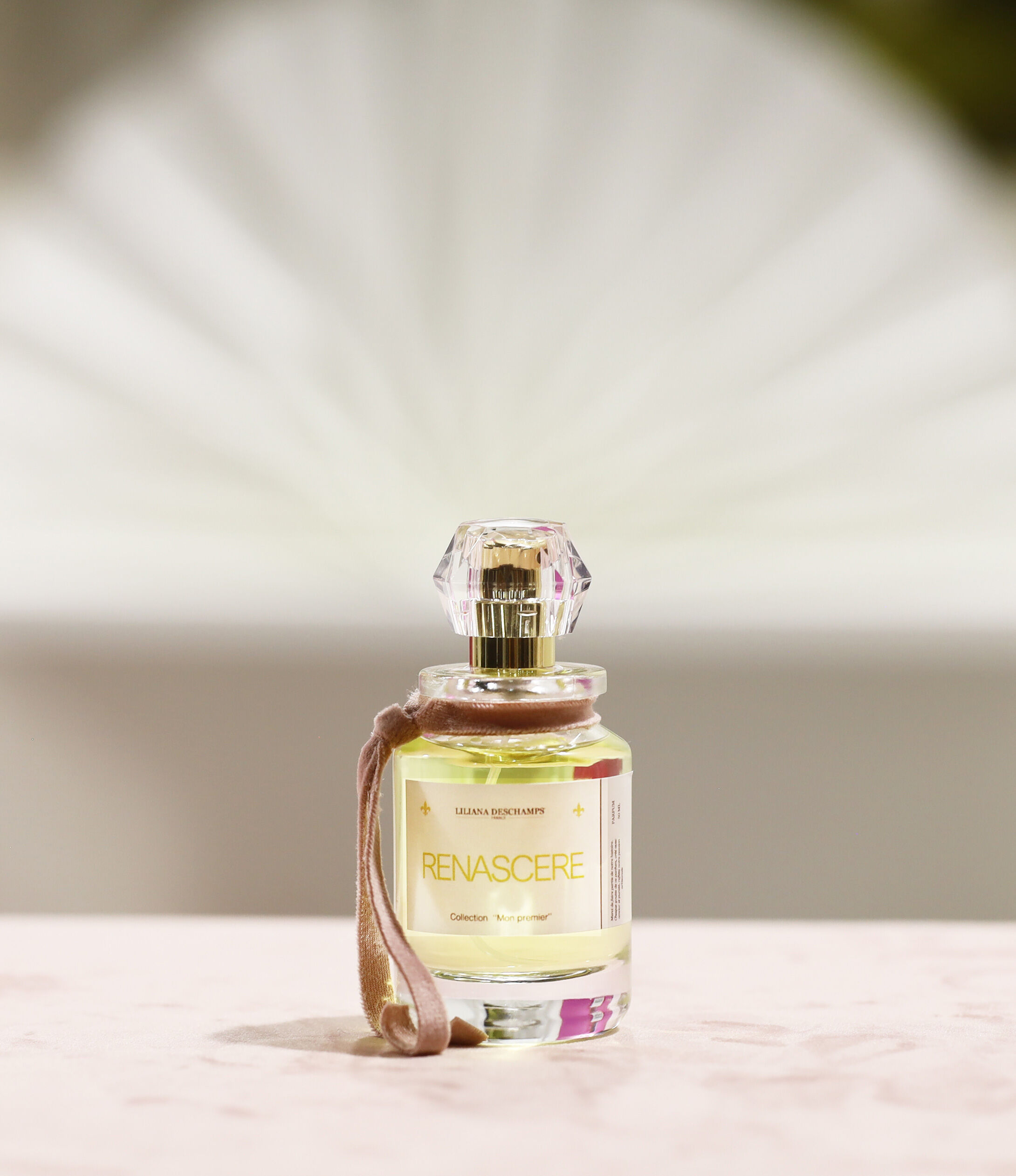 Levandule má poměrně silný ovocný podtón, který je cítit jako malinové a rybízové tóny, zatímco ostružina je podbarvena lístky fialky s charakteristickou okurkovou svěžestí. Základ z kosatce, vanilky a bílého santalového dřeva je v obou vůních stejný. Bohužel zatím není jasné, kdy budou obě Murasaki uvedeny na trh, ale další novinka značky je již k dispozici a my jsme ji na přehlídce vyzkoušeli: romantická Renascere, která kombinuje květinové akordy pivoňky a květů granátového jablka s ovocnými akordy manga a liči na bílém pižmovo-kosatcovém základu.