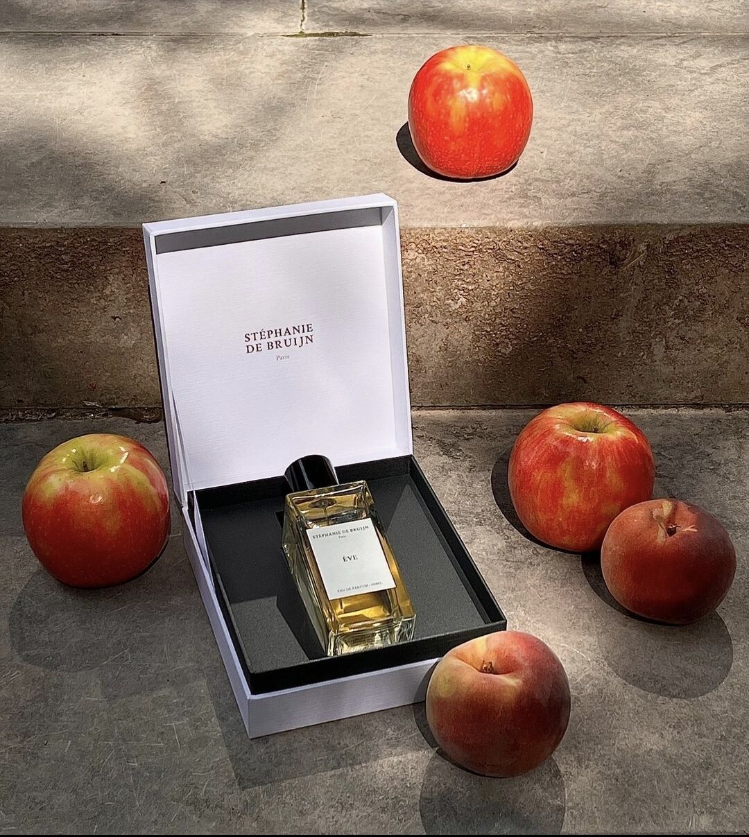 Tento rozměr najdeme opět v novince Stéphanie de Bruijn. V tomto případě to není flakon, který naznačuje jablka, ale je to samotná vůně, která vyjadřuje myšlenku "jablka lásky" a hraje jak na velmi "jablečnou" fantazii, v souladu s názvem Eve, tak na gurmánský rámec evokující určitou nevinnost. Koneckonců, když se vrátíme k mýtu, mluvíme o nevinnosti, o nevinnosti ráje, kde Adam a Eva žili, než byli vyhnáni za to, že kousli do slavného jablka.