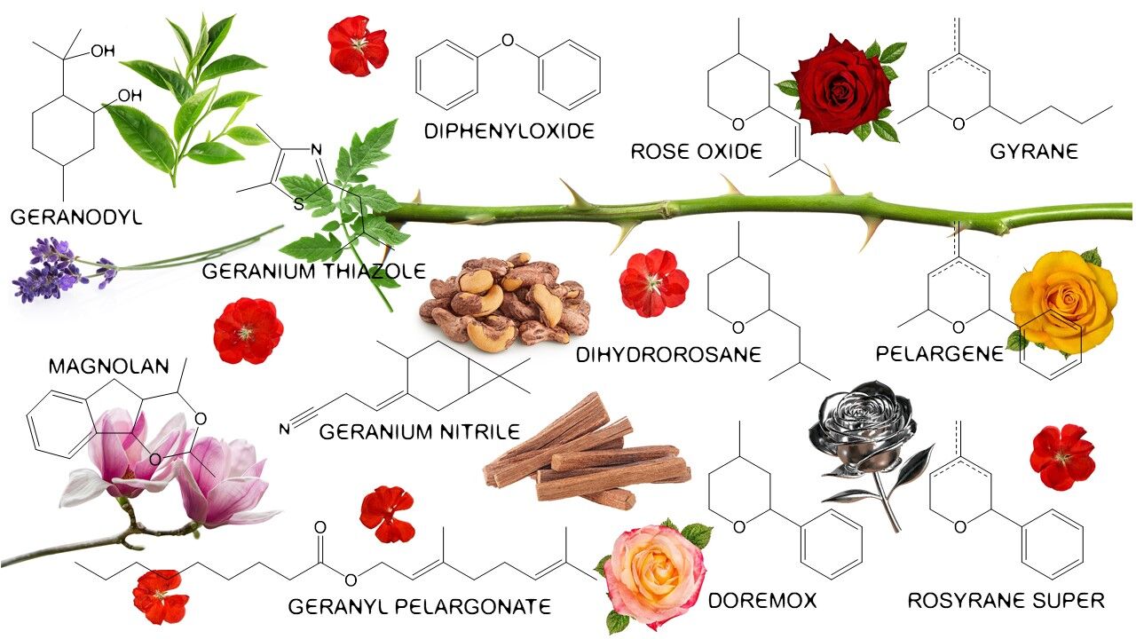 Například látky jako geranodyl a gyran (Givaudan) zvýrazňují vrchní tóny geranie, zejména v kombinaci s dalšími zelenými vonnými látkami. Oxid růžový, ačkoli je přítomen ve spektru izomerních vlastností, je často nahrazován nebo obohacován jinými sloučeninami, jako jsou doremox, dihydrorosan a rosyrane super. Za zmínku stojí také velmi "geraniím podobný" difenyloxid (někdy nazývaný geraniové krystaly): před objevením oxidu růžového se difenyloxid používal v růžových akordech jako alternativa.