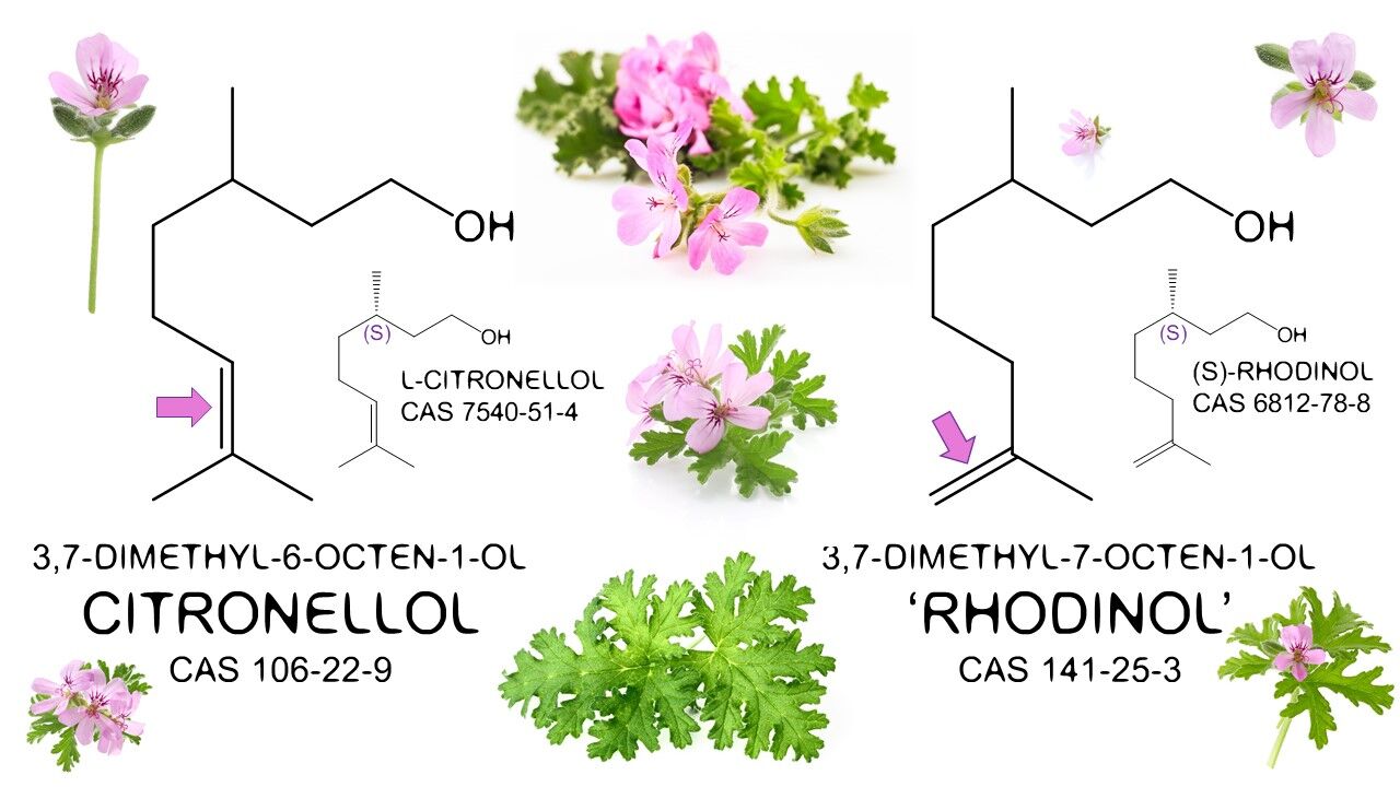 Materiálem hodným zvláštní zmínky je rhodinol, přesněji "Rhodinol ex geranium." Jedná se o centrální frakci geraniové silice, která se skládá převážně z alkoholů: geraniolu a citronellolu. V obou případech jsou frakce vybírány čistě z estetického hlediska parfuméry se speciálními odbornými znalostmi v této oblasti. Rodinol se samozřejmě jako každý přírodní produkt výrazně liší v závislosti na svém původu, dodavateli a výrobci. Vůně přírodního rhodinolu je jednoduše nádherná a není divu, že si ji oblíbilo mnoho parfumérů: rhodinol je sladký, svěží a růžový, velmi rovnoměrný a dlouhotrvající.
