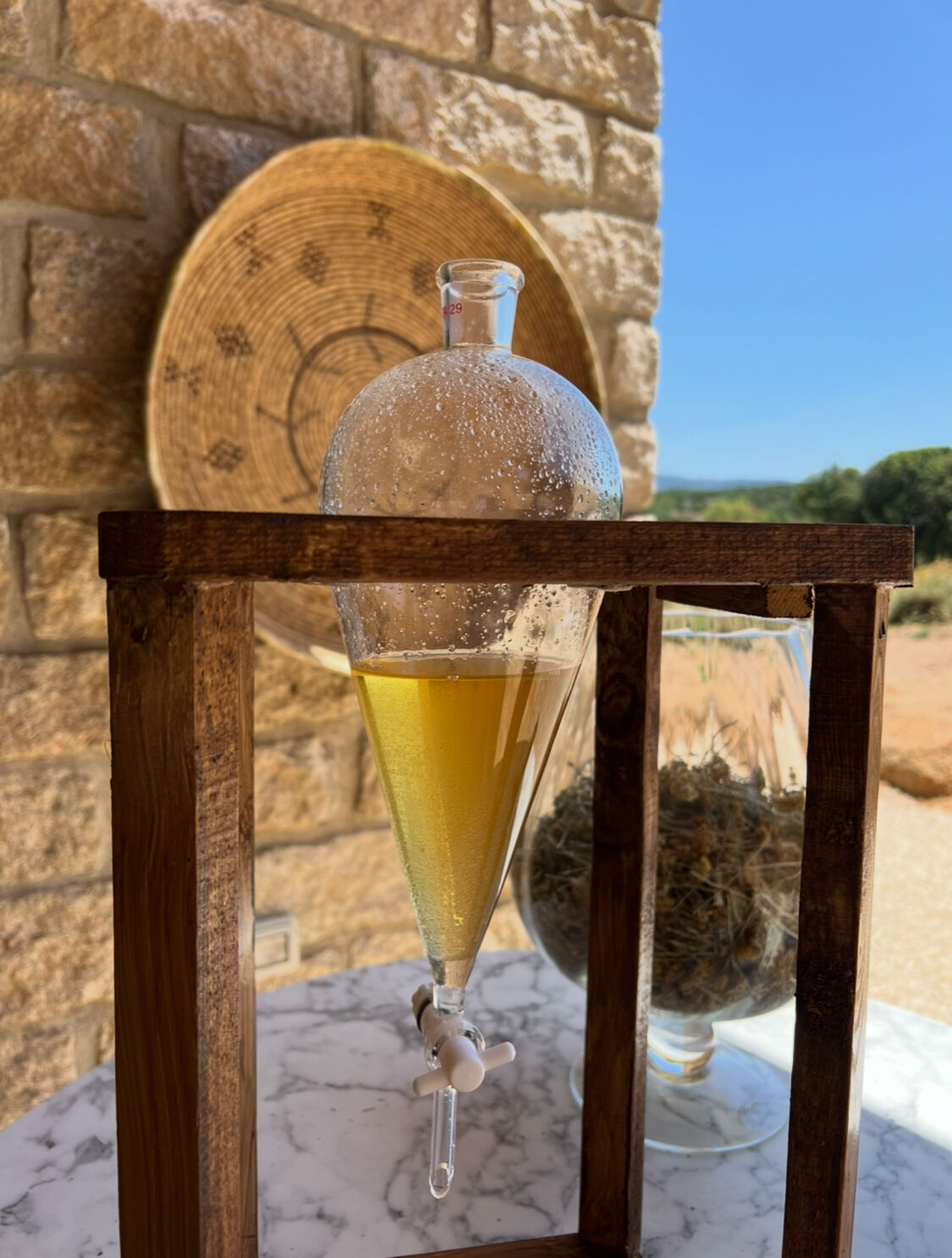 Esenciální olej z immortelle získáváme parovodní destilací – přírodní metodou, která odděluje aromatické složky z čerstvé rostliny bez použití chemických rozpouštědel. Destilaci provádíme přímo na našich polích, v tradičním destilačním zařízení. Každá destilace trvá zhruba tři hodiny a přestože je tento proces zdlouhavý, immortelle vydá jen nepatrné množství oleje – z velkého objemu rostliny získáme jen pár kapek.