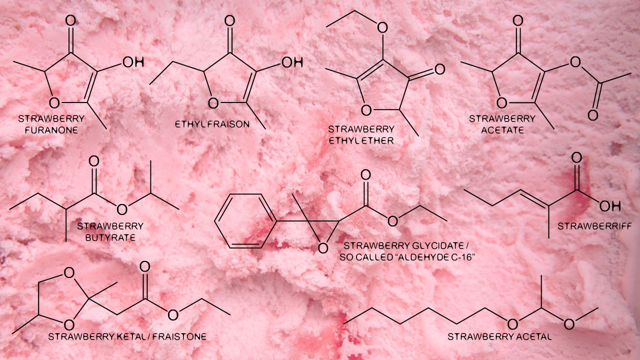 Tak to stojí v přírodě, ale i parfuméři mají svá malá tajemství. Dlouhou dobu byla látka, kterou se začínala stavba jahodového akordu, takzvaný jahodový glycidát neboli "aldehyd C-16" (z chemického hlediska to vůbec není aldehyd). Tato látka má poměrně sladkou ovocnou vůni s medovými tóny, která skutečně matně připomíná jahody. V minulém století se bez této sloučeniny neobešlo téměř žádné jahodové aroma.