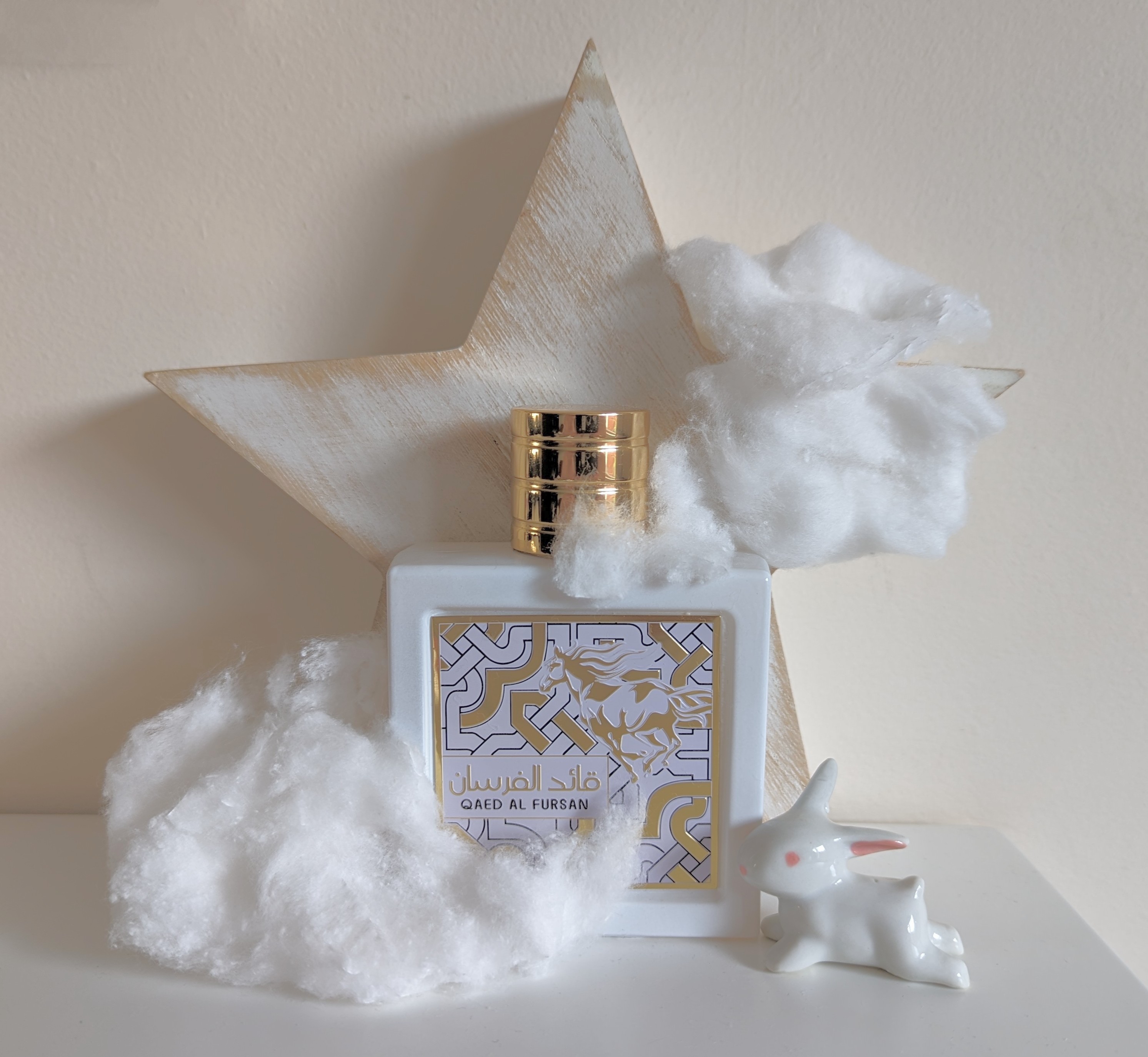 Ach ta bílá. Qaed Al Fursan Unlimited. Tohle má k hřebci hodně daleko. Rytíř odletěl do oblak. Ne jako Pegas. Spíš jako My Little Pony. Ve skutečnosti je to malý načechraný králíček! Králíček má také malý ananas, ale většinou ho zavírá obrovský kokosový ořech na jeho vrcholu. Krásně laktonická, přesto lehká a vzdušná, nikdy se nepřehoupne do obávaného teritoria "dětské nemoci", do kterého tyto tóny někdy mohou spadnout (například Chabaud Lait, mně se líbí, ale mému okolí většinou ne ). Komu se líbí Blanche Bête (někdo ji popsal jako "dech novorozence", což je podle mě také krásné), tomu se bude velmi pravděpodobně líbit i tato (už jen proto, že je za n-tou cenu). Celkově je o něco chladnější, jako letní edice Blanche Bête, ale vedle sebe jsou si tyto dvě velmi podobné v polovině. Pokud jde o sušení, je stejná. Bête je na začátku hřejivě kořeněná, Qaed je na začátku velký chladivý kokos, ale začne se výrazně zklidňovat a pak se z něj stane krémový vanilkový mléčný koktejl ylang-ylang. Obě působí nadýchaně, sladce a nevinně.