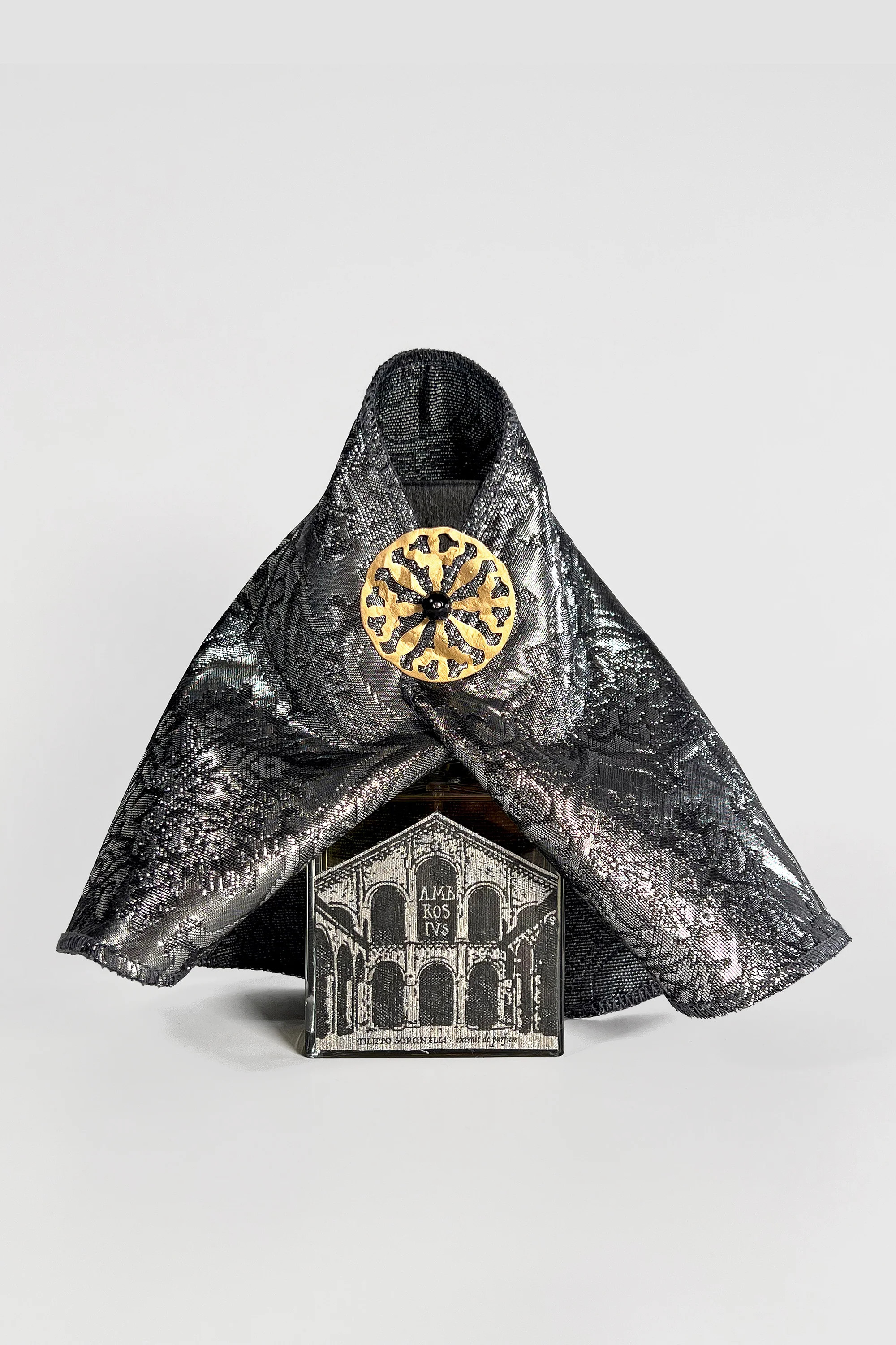 Na flakonu je vyobrazena silueta průčelí středověké ambroziánské baziliky, zhotovená z látky. Víčko je zakryto cope neboli posvátným rouchem v podobě pláště, který nosí biskup při procesích. Plášť, vyrobený ze stříbrného brokátu z archivu ateliéru LAVS Filippa Sorcinelliho, je "zapečetěn" zlatou kovovou filigránovou rozetou s onyxovou kuličkou zasazenou uprostřed.