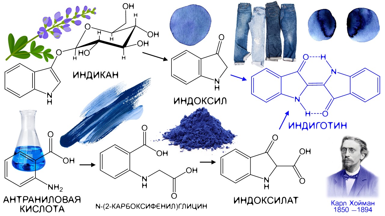 Indigo bylo poprvé chemicky syntetizováno v roce 1870 německým chemikem Adolfem von Baeyerem. Další německý chemik Karl Heumann navrhl koncem 19. století poměrně jednoduchou a levnou metodu syntézy. Na začátku 20. století začaly společnosti jako BASF a Hoechst vyrábět syntetické indigo pomocí vylepšené verze Heumannovy metody. Do začátku první světové války syntetické indigo téměř zcela vytlačilo z trhu přírodní indigo, protože bylo výrazně levnější.