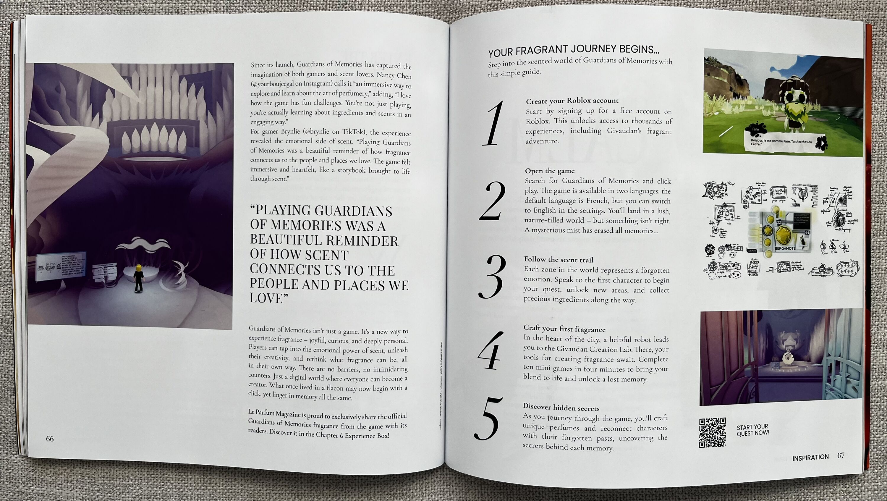 Exkluzivně v tomto boxu najdete malý sprejový „mod“ flakonek Cache Bloom – ovocně-květinovou vůni, kterou pro Le Parfum Chapter 6 Experience Box vytvořila Dana Schmitt. Tento parfém je dostupný pouze v tomto boxu a jeho inspirací byla hra Roblox „Guardians of Memories“, projekt společnosti Givaudan. Ve hře hráči vstupují do kouzelného světa, kde každá vůně odemyká vzpomínku a každá vzpomínka odhaluje další vrstvu emocí. Cíl? Probudit zvědavost mladých milovníků vůní a ukázat jim, jak jsou vůně, emoce a vzpomínky hluboce propojené... Vůně tu není jen produktem. Je cestou. Vzpomínkou v pohybu. Příběhem, který se rozvíjí s každým krokem hry – od sbírání ingrediencí a míchání parfémových kompozic až po skládání zapomenutých vzpomínek.