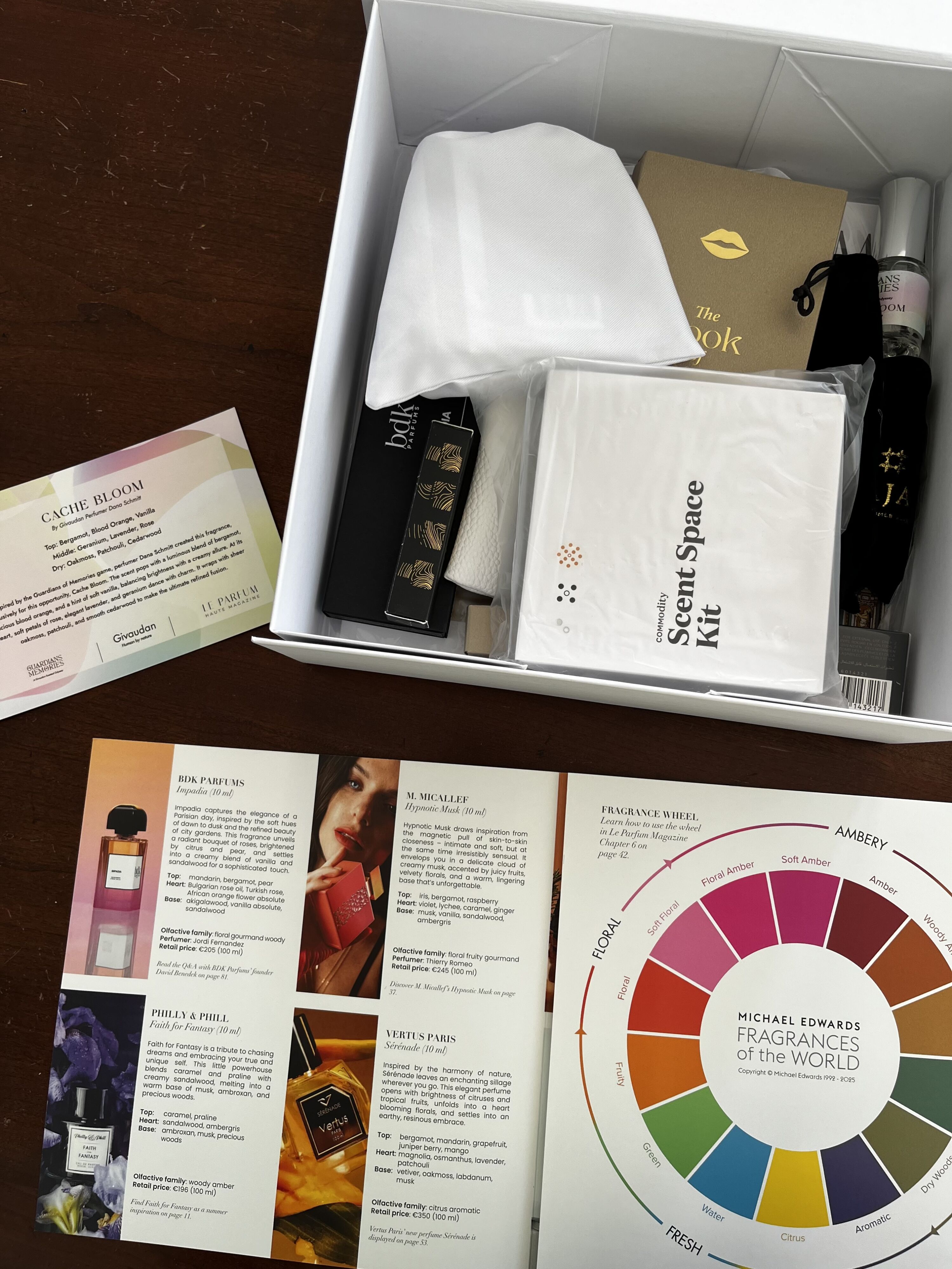 Letní box 2025 obsahuje vloženou Fragrance Wheel jako doplněk k článku s Michaelem Edwardsem, autorem a lektorem. Článek podrobně vysvětluje, jak kolečko používat, a nabízí tipy pro každodenní život.