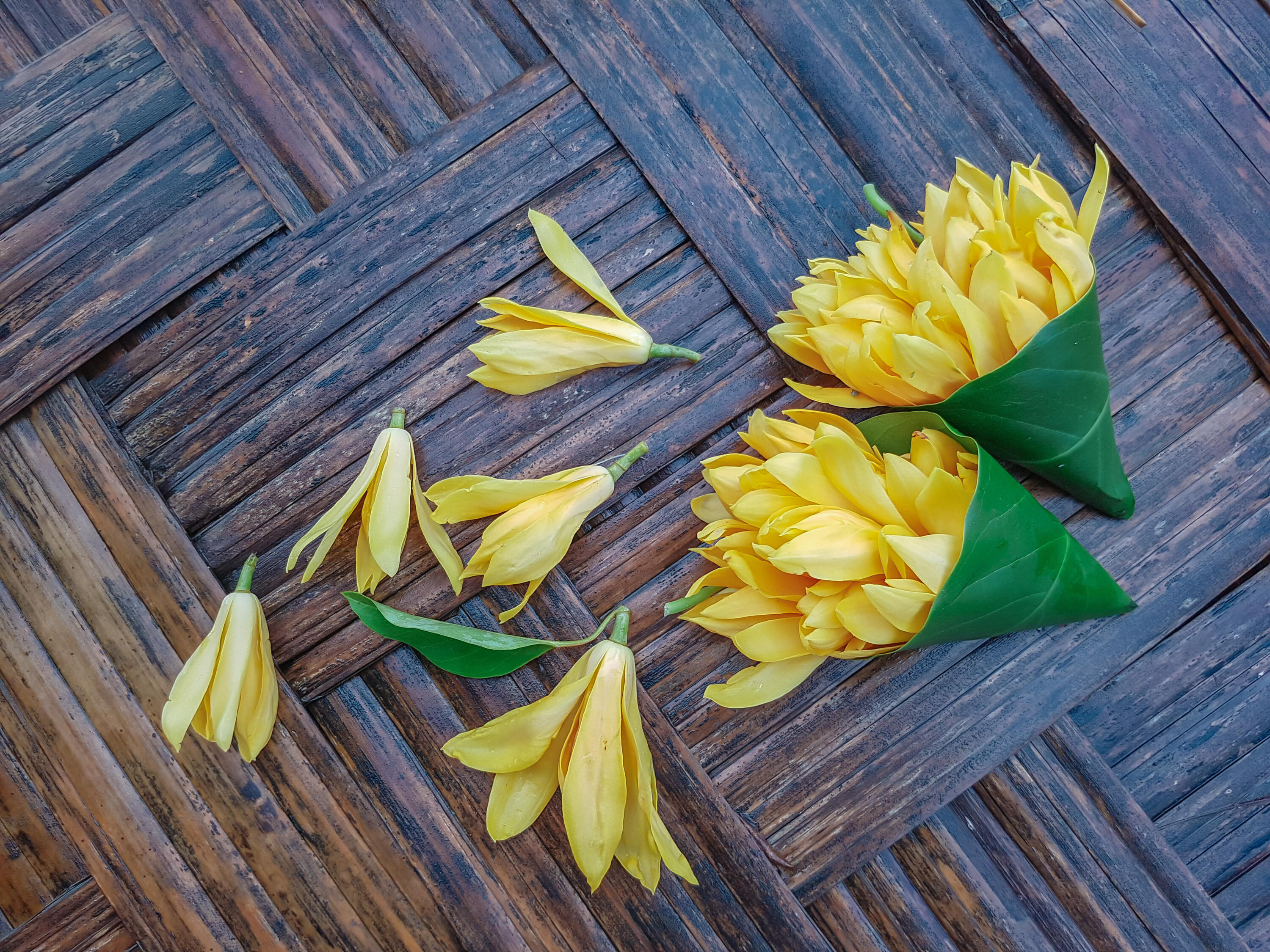 Žlutá champaca naproti tomu obsahuje těžší aromatické estery, jako je methyl benzoát a benzyl acetát. Ty vůni propůjčují hutný, ovocně-květinový, lehce lakovaný a dokonce poněkud „high-tech“ charakter, evokující uhlíková vlákna nebo neopren. Profil champacy obsahuje také významné množství kyseliny fenyloctové a fenylacetátů, které vytvářejí hluboký medový, kořeněný, růžový a slabě tabákový podtón, jenž v extrémních koncentracích může hraničit s lehce urinózním nádechem. Její ovocné aspekty pocházejí hlavně z β-iononu a dihydro-β-iononu, které vůni propůjčují fialkovo-malinovou nuanci.
