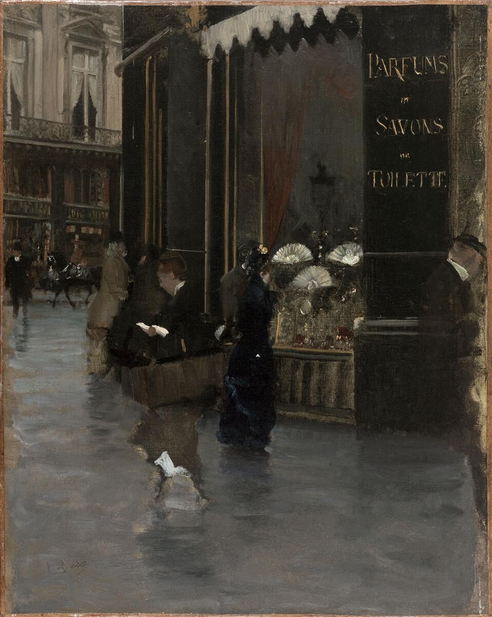 Parfumerie Violet na rohu Boulevard des Capucines a Rue Scribe, Giuseppe De Nittis, cca 1880
