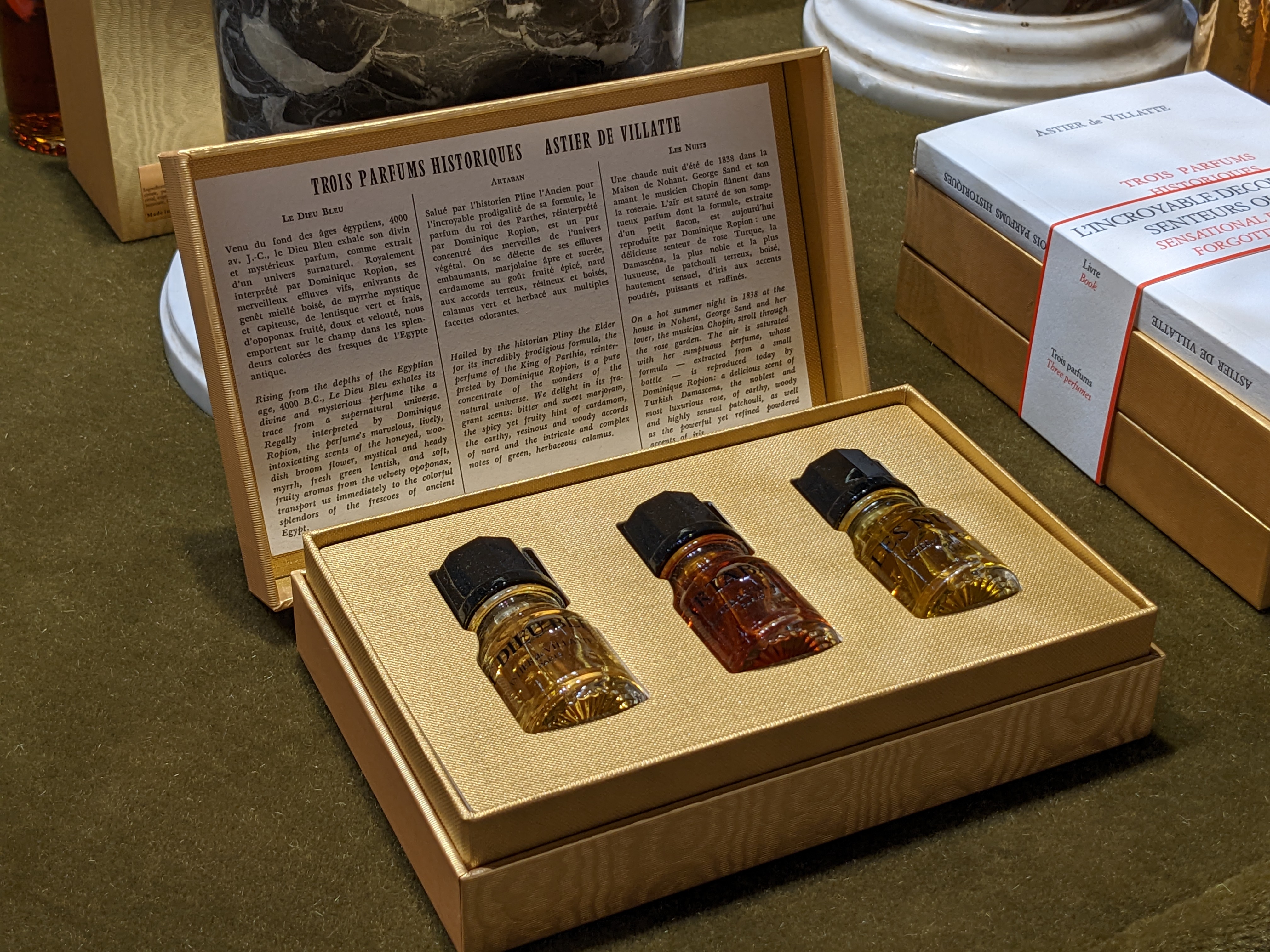 Parfumér Dominique Ropion zrekonstruoval parfém George Sandové pro společnost Astier de Villatte. Nyní se prodává pod názvem Les Nuits. Je to velmi hutná, bohatá, smyslná vůně, dokonale odpovídající stylu starofrancouzské aristokracie; to znamená, že v případě potřeby dokáže zamaskovat téměř jakoukoli cizí vůni. Ale ve 40. letech 19. století, kdy George Sandová používala tyto parfémy během svého poměru se Chopinem, sloužily jistě ke svádění, nikoli k maskování, protože v té době už přišly do módy pravidelné koupele a každodenní výměna spodního prádla a objevily se technologie chemického čištění. Myslím, že markýza de Villeparisis mohla milovat parfémy jako Les Nuits, které se hodí jak dobově, tak stylově.