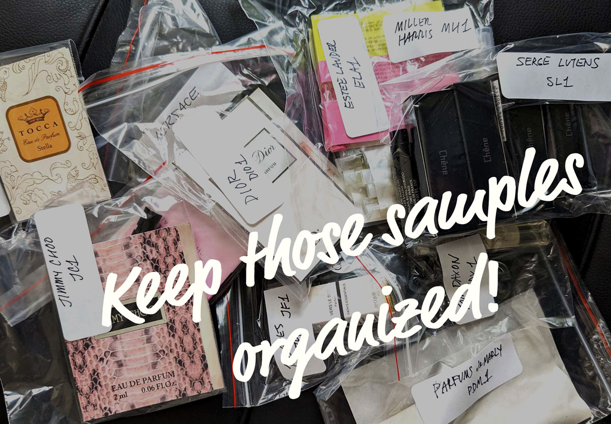 Organizace mých vzorků je jedním z mých opakujících se novoročních předsevzetí týkajících se parfémů. Letos bych si je ráda dala skutečně a měla je uspořádané. S každým novým rokem si pohrávám s trochu novějšími způsoby, jak část z nich spravovat, a prostě nikdy neskončím u žádné metody. Bylo by hezké, kdybych mohla mít své vzorky abecedně uspořádané, uložené ve svislé poloze se snadno viditelnými názvy a mít tam nějaký křížový odkaz, ukazující mé sympatie a ochotu k opětovnému testování nebo potenciál v hodnotě celé lahvičky, vše čitelné jedním snadným pohledem. Nicméně jsem pokořena více než 10 lety nedosažení mého organizačního cíle a stále rostoucím repertoárem vzorků a odsřiků. Vím, že je to proti pravé parfumistce ve mně, ale ráda bych pro začátek viděla všechny své kousky prostě shromážděné podle abecedního názvu jejich značky. Třeba v malých organzových sáčcích, aby se ušetřilo místo. Alespoň tento dosažitelný cíl by mi umožnil relativně snadnější přístup k mým vzorkům a měla bych je všechny na jednom místě. Držte mi palce, ať se mi daří držet směr.