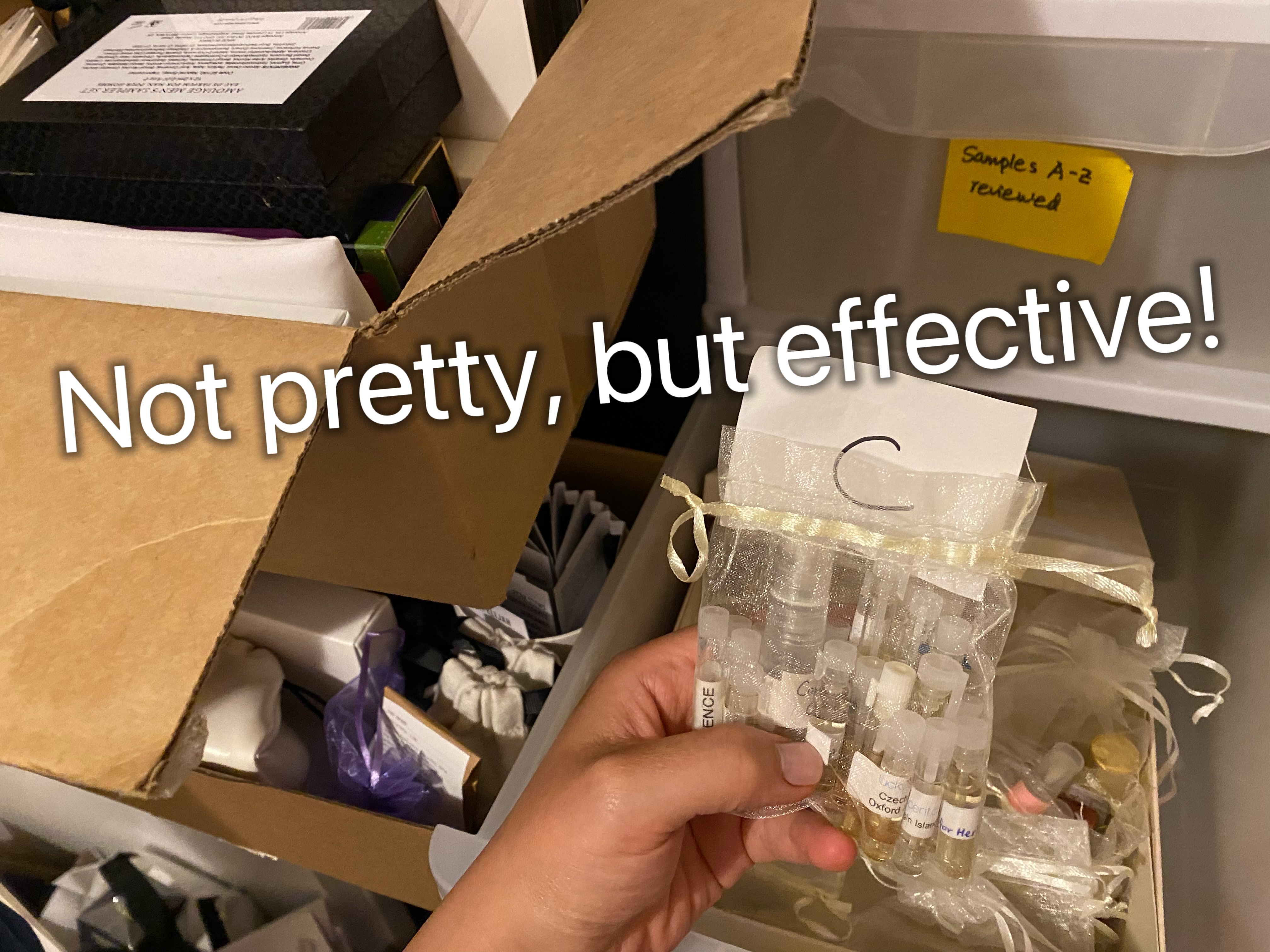V neposlední řadě, jak už řeklo několik mých kolegů, mít mnoho vzorků může být skvělé, ale náročné. Měl jsem metodu, která nějakou dobu fungovala, ale ukázalo se, že je těžké ji udržet. Organizace drobných položek, jako jsou vzorky parfémů, je náročná, protože se dodávají v různých formátech, a také je možná budete chtít uspořádat specifickým způsobem (možná je rozdělit podle data, podle parfumérské firmy, podle typu parfému?) Pak je to samozřejmě všechno k ničemu, pokud to nemáte někde zdokumentované v tabulce. Může se stát, že v procesu organizování zjistíme, že jsme zahlceni a chceme to vzdát. Letos jsem si však slíbil, že to nevzdám. Klíčem je najít systém, který funguje a není tak omezující, aby se nedal dodržovat. Ale já mám vždycky rád výzvy.