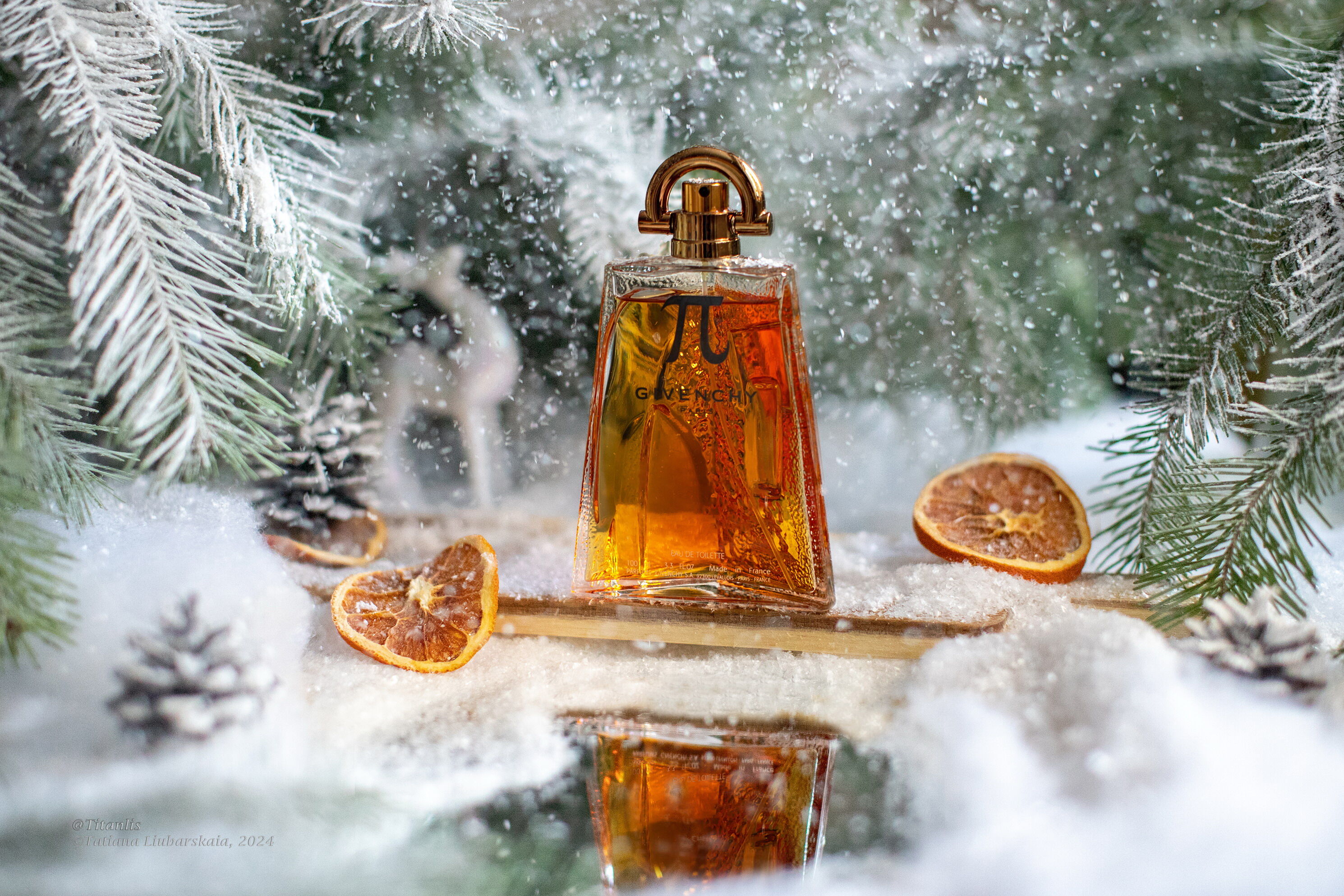 Veselá a útulná Pi Givenchy, pryskyřičná dřevitá vůně se suchou, kořeněnou vanilkou, mandlemi, pomeranči a lékořicovými lízátky v neobvyklém, atraktivním flakonu, si o toto vánoční focení přímo říkala.