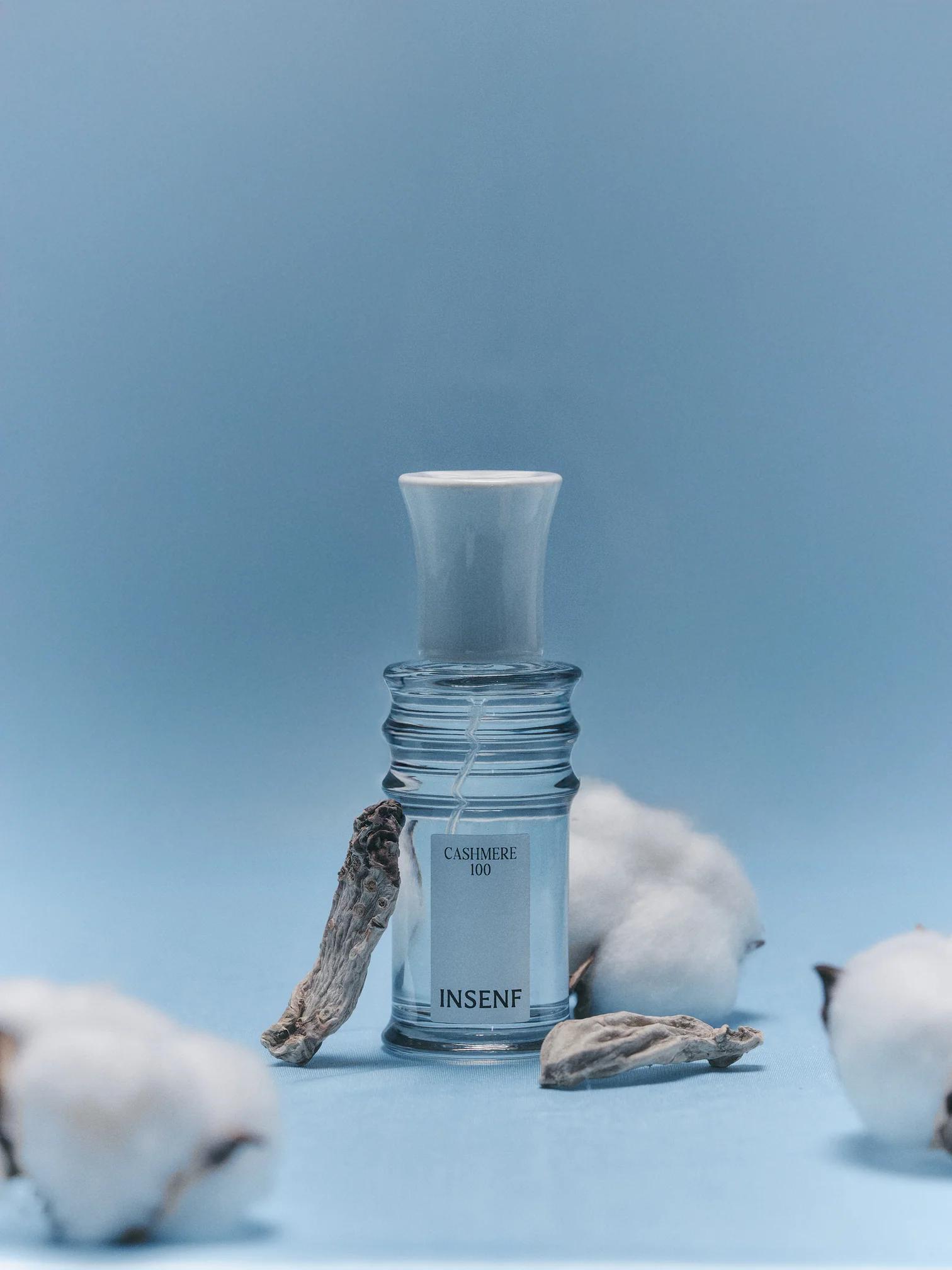 V kolekci parfémů věnované oděvům nesmí samozřejmě chybět kašmír – pro INSENF je to Cashmere 100, hebký a něžný jako kašmírový rolák. Pocit teplých, jemných vlněných vláken navozuje kašmeran, zatímco kosatec a bílé pižmo podtrhují efekt útulného, průsvitného kokonu. Vůně INSENF má téměř obrácenou pyramidu: jak se rozvíjí směrem k základu, objevují se další odstíny – santalové dřevo, vanilka a bílé květy.
