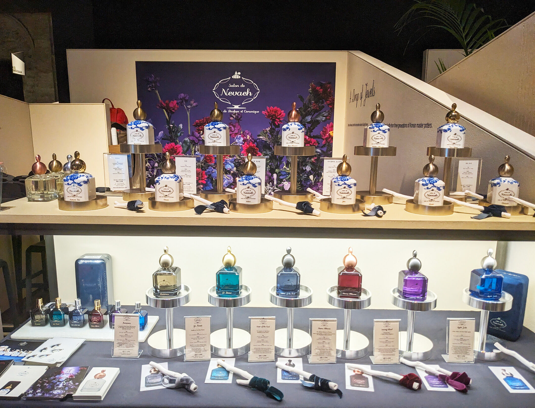 S některými jihokorejskými značkami jsem se setkala už na předchozích výstavách ve Florencii a Miláně, ale tentokrát mě zaujal Salon de Nevaeh: nešlo přehlédnout bílé porcelánové flakony s kobaltovou malbou a černé s perleťovou intarzií. Historie Salon de Nevaeh přitom začala právě porcelánem – v roce 2007 vyvinuli technologii výroby keramických lahviček, které dokážou zabránit odpařování parfému. Současně se firma věnovala tvorbě signaturních parfémů pro různé korporace.