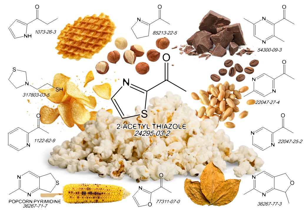 Izolovaně jsou molekuly zodpovědné za vůni popcornu nesmírně silné a nepříliš „parfémové“. Vznikají zahříváním během Maillardovy reakce a patří mezi sloučeniny obsahující síru a dusík. Ty samé molekuly často hrají klíčovou roli při utváření aroma tepelně zpracovaného masa, ryb a mořských plodů. Některé alkylthiofeny například významně přispívají k vůni kukuřice a popcornu, zatímco samotný 2-methylthiofen voní spíše jako cibule a dodává vůni syrového krabího masa charakteristickou nuanci připomínající benzín.
