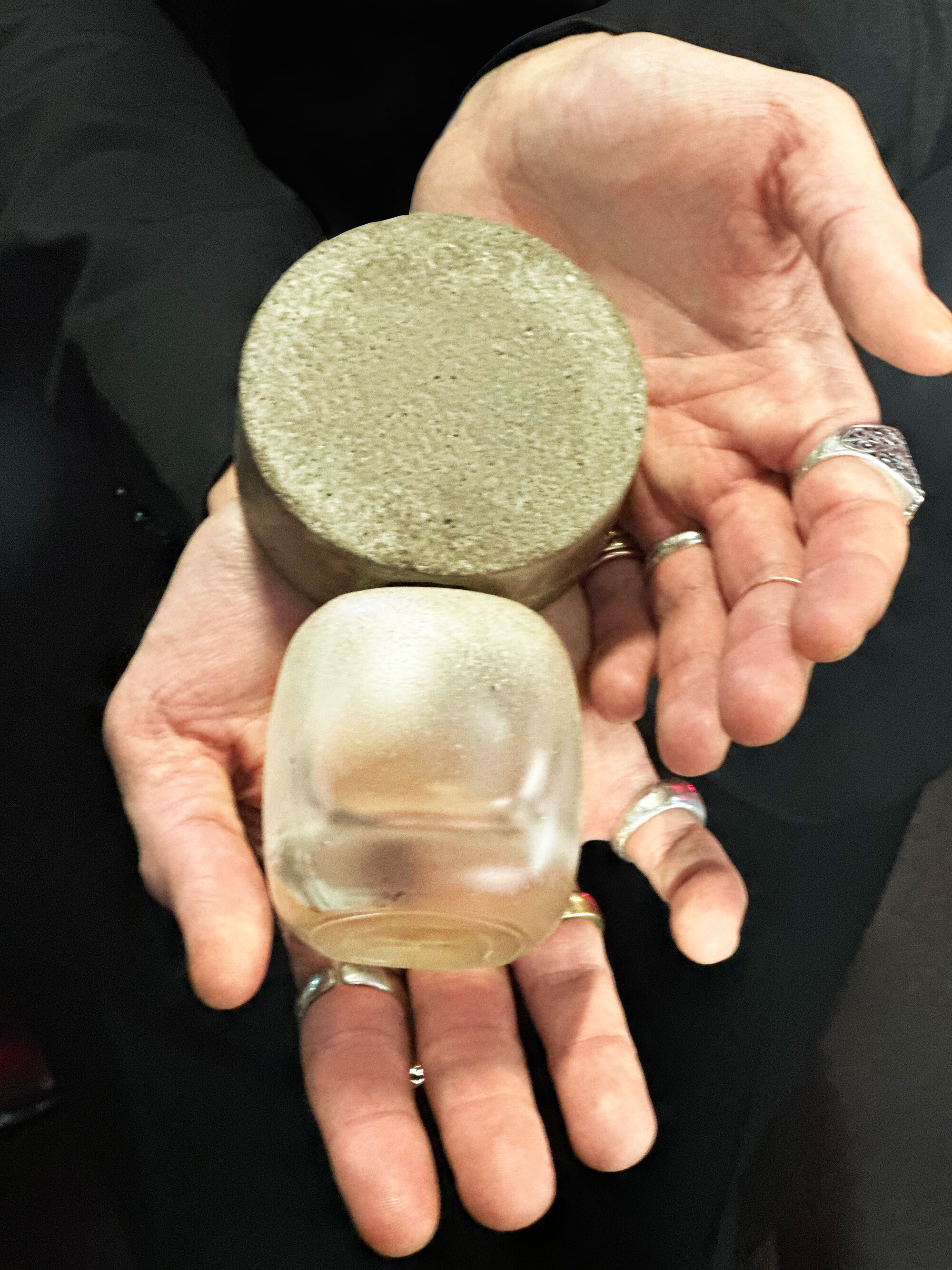 Samotný uzávěr, který vypadá jako dva kusy korodujícího kovu (nebo potenciálně kamene) s měděnými, červenými a hnědočernými skvrnami, má na boku zatlučený a ohnutý hřebík. Šokující je, že hřebík je zcela reálný, a dokonce i jeho špička je více než ostrá.