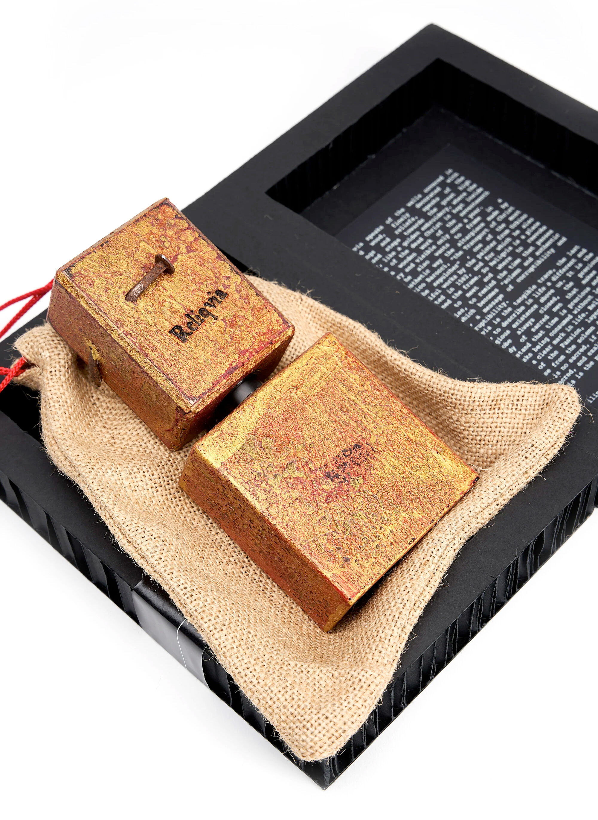 Na horní straně se objevuje cejchovaný název, který hláskuje: Reliqvia.
