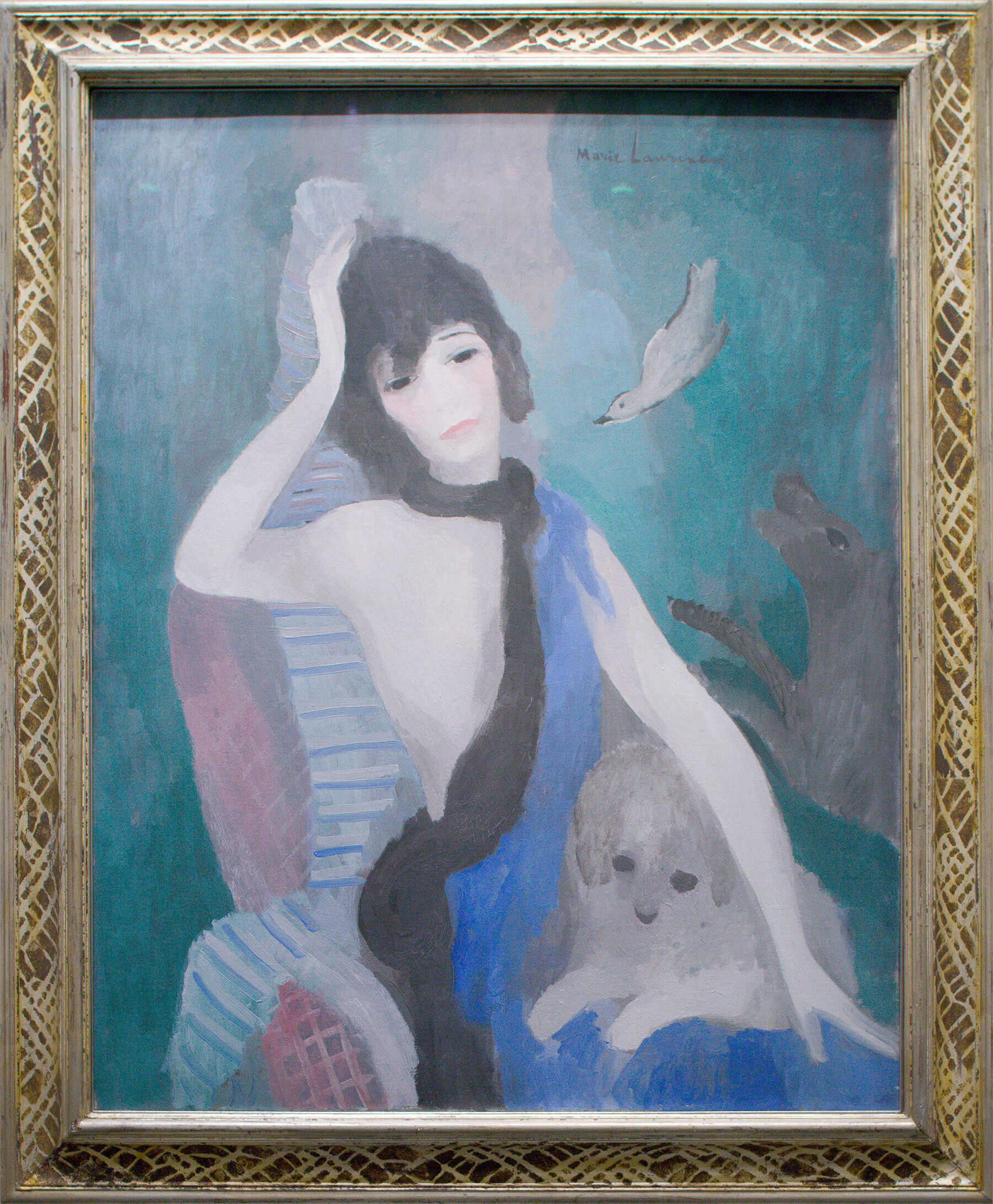 Při vícenásobném nošení se mi vybavil portrét Mademoiselle Chanel, který namalovala Marie Laurencin v roce 1923. Holubičí šeď přechází do zelené kolem její postavy, která je zahalená závoji a ptačími křídly. Po okrajích dámy a jejího prostředí vzniká jemný, téměř popelavý ruměnec. Podobně si hraje i ústřední kosatec; velmi popisně vykreslený, aniž by ztěžknul, tančí mezi impresionistickou svěžestí a budoárovou krémovostí, než se blýskne šustivým stříbřitým pokovením.