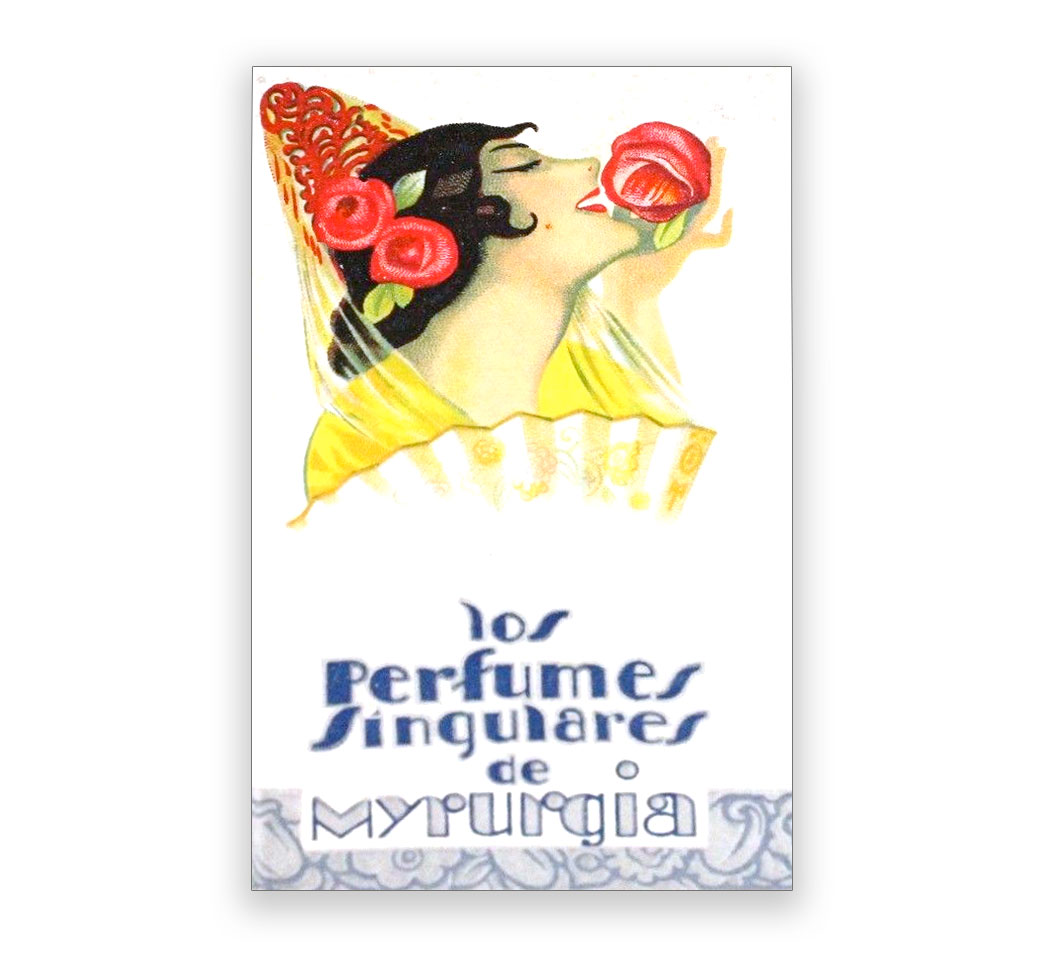 Pohlednice mezitím nebyla pouhým poštovním lístkem, ale reklamou na dům Myrurgia. V té době už jsem o této parfumerii věděla - vytvořila nejslavnější vůni se španělskou příchutí, Maja. Mé vlastní seznámení s Majou se v té době omezovalo na mýdlo a kolínskou vodu, z nichž ani jedna mě nenadchla (nota bene: člověk by nikdy neměl posuzovat historický parfém podle mnohem pozdějších toaletních verzí). Ale parfémy Myrurgia - jakékoliv, nejen Maja - byly vzácným nálezem a z nějakého důvodu nehorázně drahé. Odkládala jsem je na "někdy" a to "někdy" teď přišlo v podobě té pohlednice.