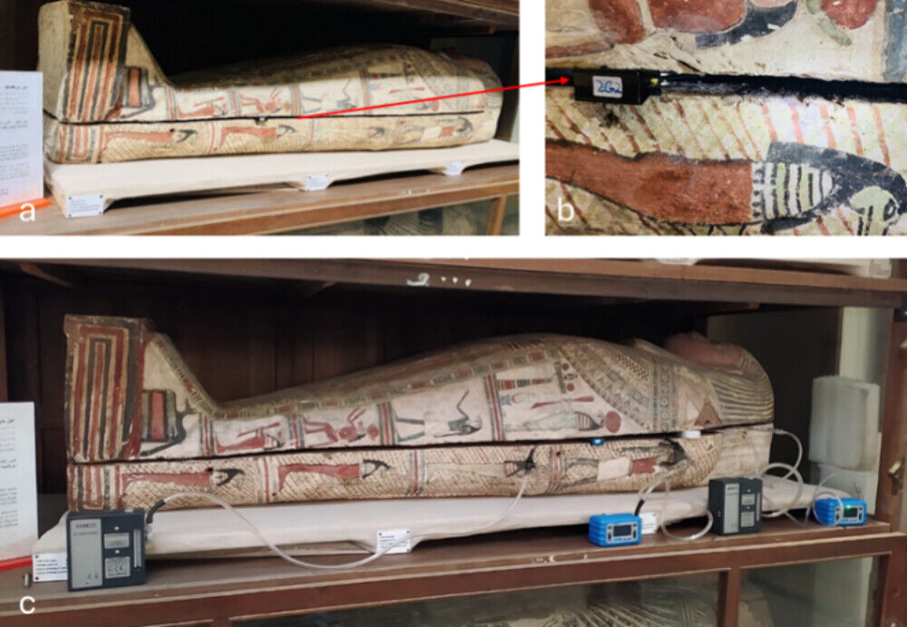 (A) Rakev s mumifikovaným tělem ve výstavní části Egyptského muzea v Káhiře. (B) Pasivní odběr vzorků pomocí vlákna SPME z prostoru nad hlavou uvnitř rakve. (C) Aktivní odběr vzorků prostoru nad hlavou uvnitř rakve byl proveden pomocí sorpčních trubiček.