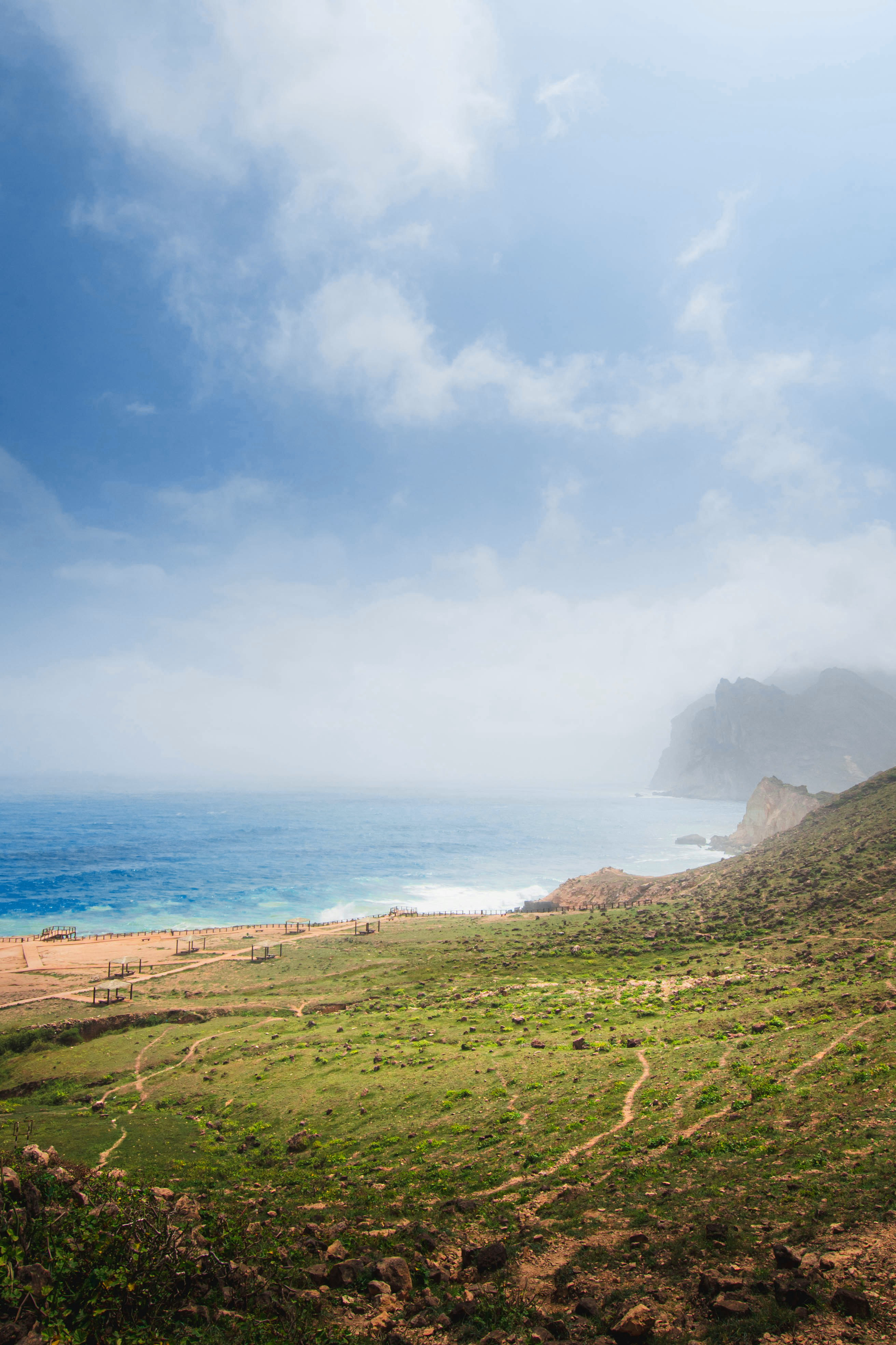 Mlhavý den v Mughsailu, Salalah, Omán — období khareef.