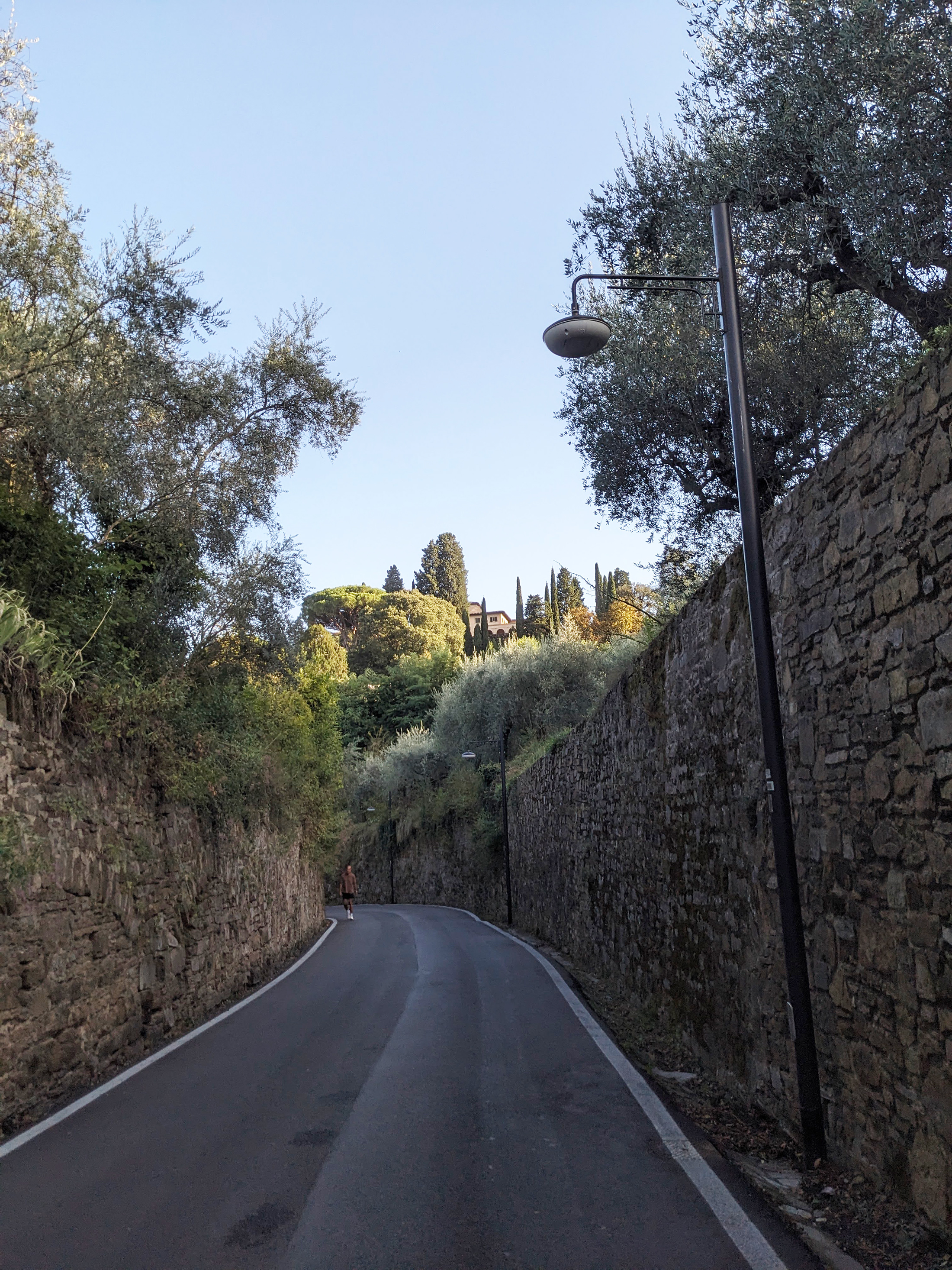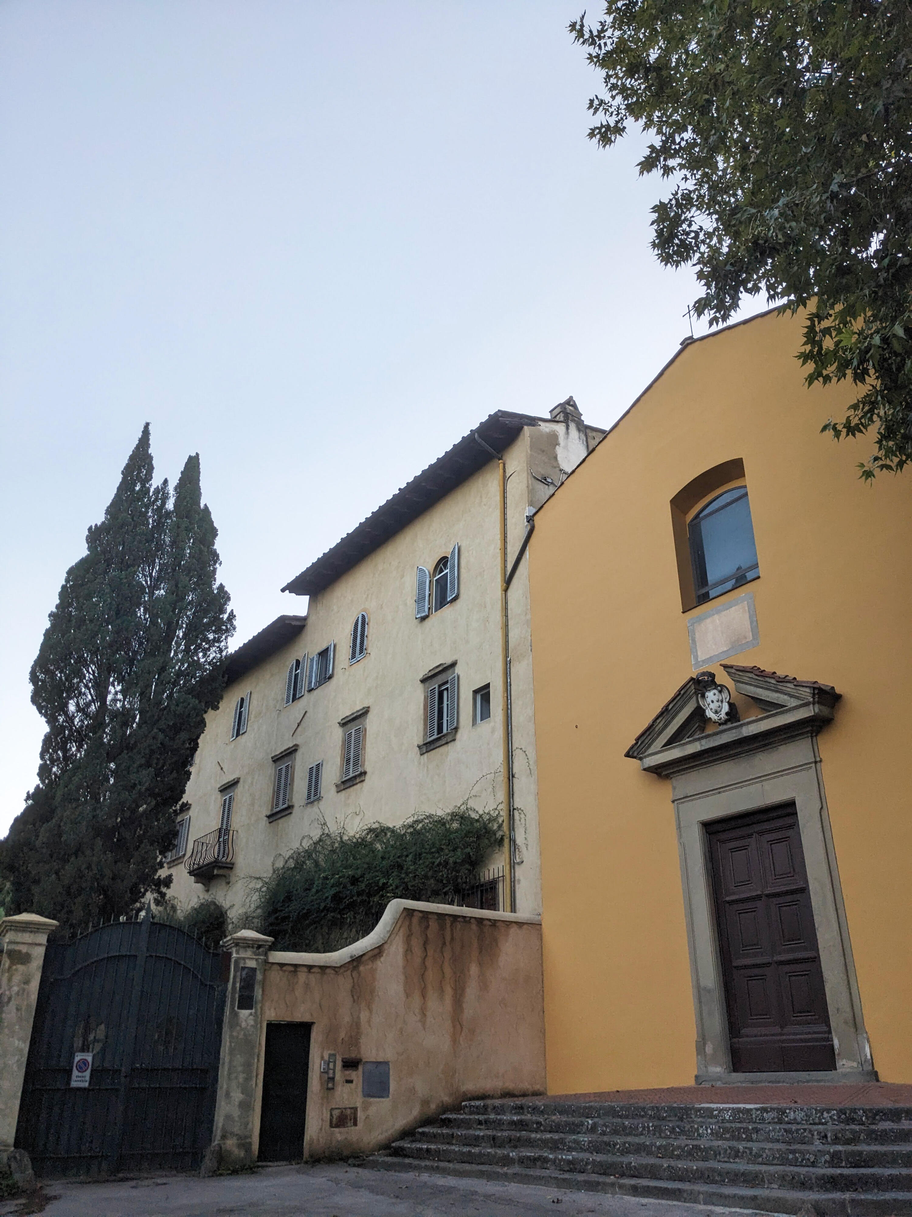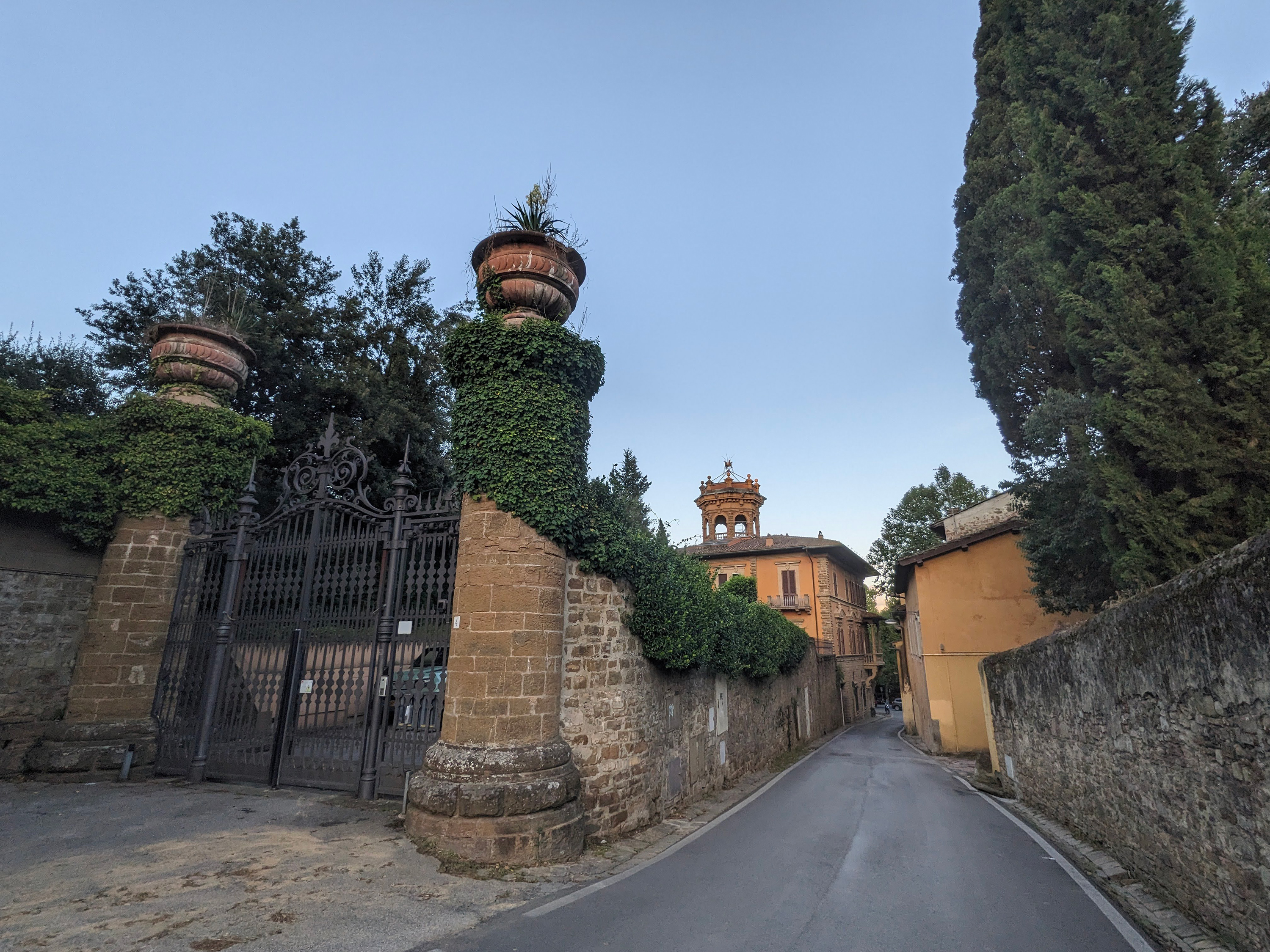 Mám podezření, že James a jeho okruh často volili druhou trasu pro její čistě vizuální půvab. Je kratší a mnohem malebnější, nabízí široké výhledy na město i okolní olivové háje. Procházka začíná u historické brány Porta Camaldoli (dnešní Piazza Torquato Tasso), stoupá po Via di San Francesco di Paola a — s poslední pravou odbočkou na Via di Bellosguardo — vás dovede až na samotný hřeben kopce.
