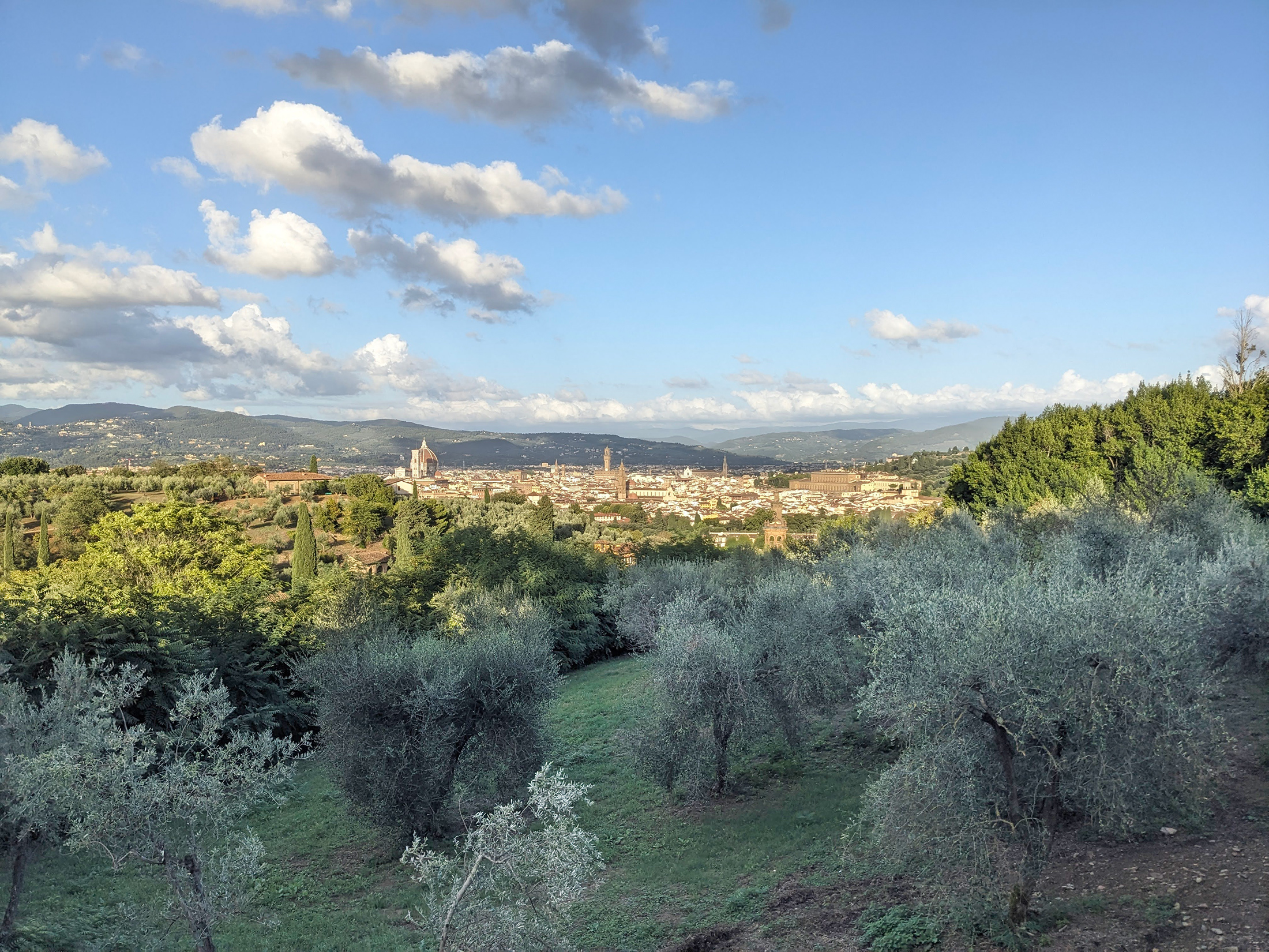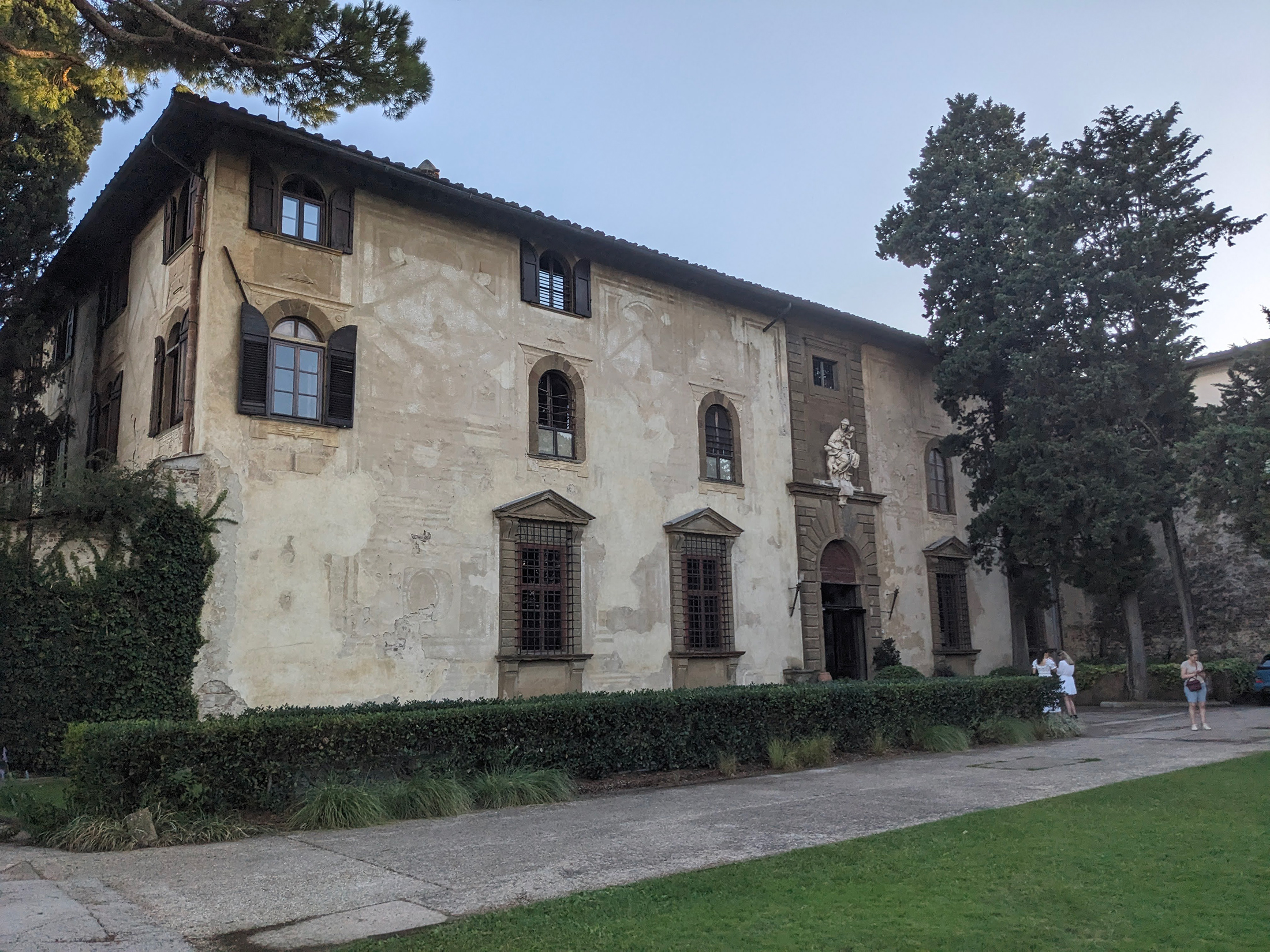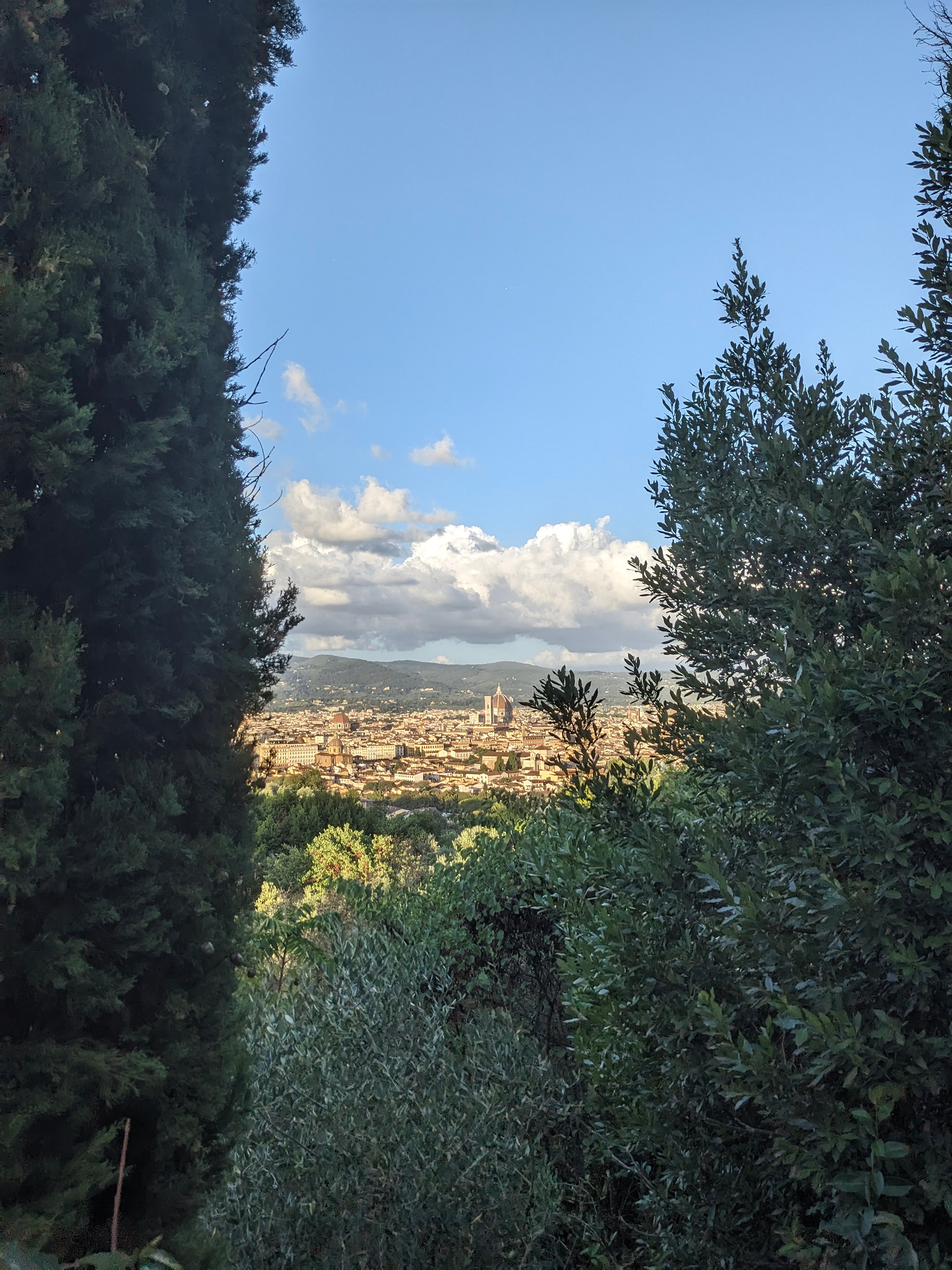 Když tam stojíte, výhled sevřený mezi stoupajícími zdmi obou vil působí jako živý obraz v rámu. Uchovává přesně tu krajinu, kterou kdysi pozorovali Henry James, jeho nejbližší okruh i hrdinové Portrétu dámy: zvlněné toskánské kopce a věčný průvod mraků putujících nad městem.