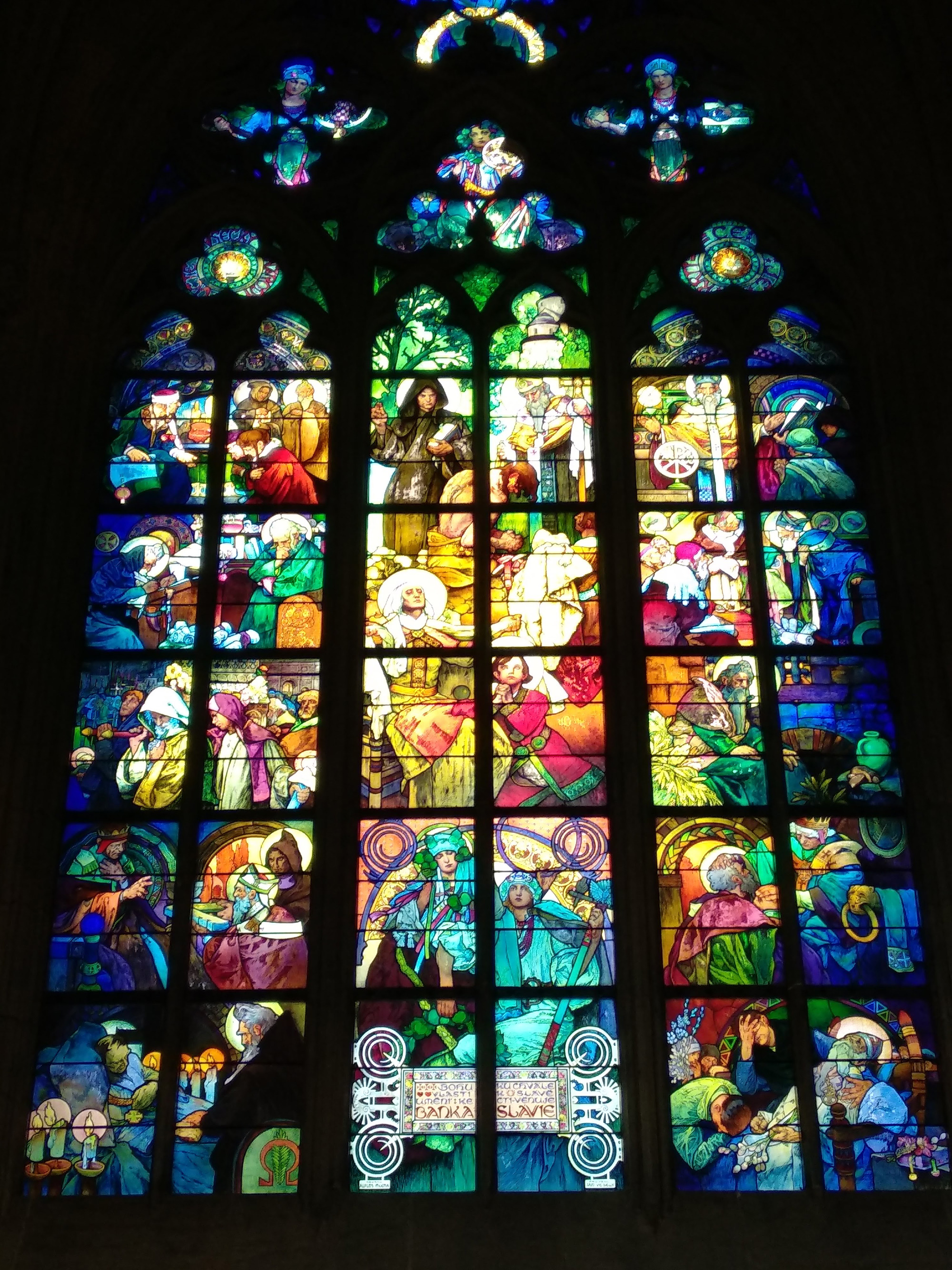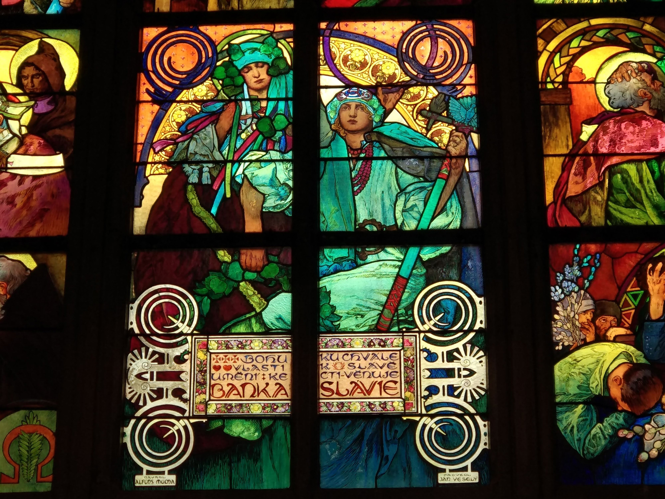 Alfons Mucha, vitráž v Metropolitní katedrále svatého Víta, Václava a Vojtěcha v Praze. Níže je fragment téhož díla.