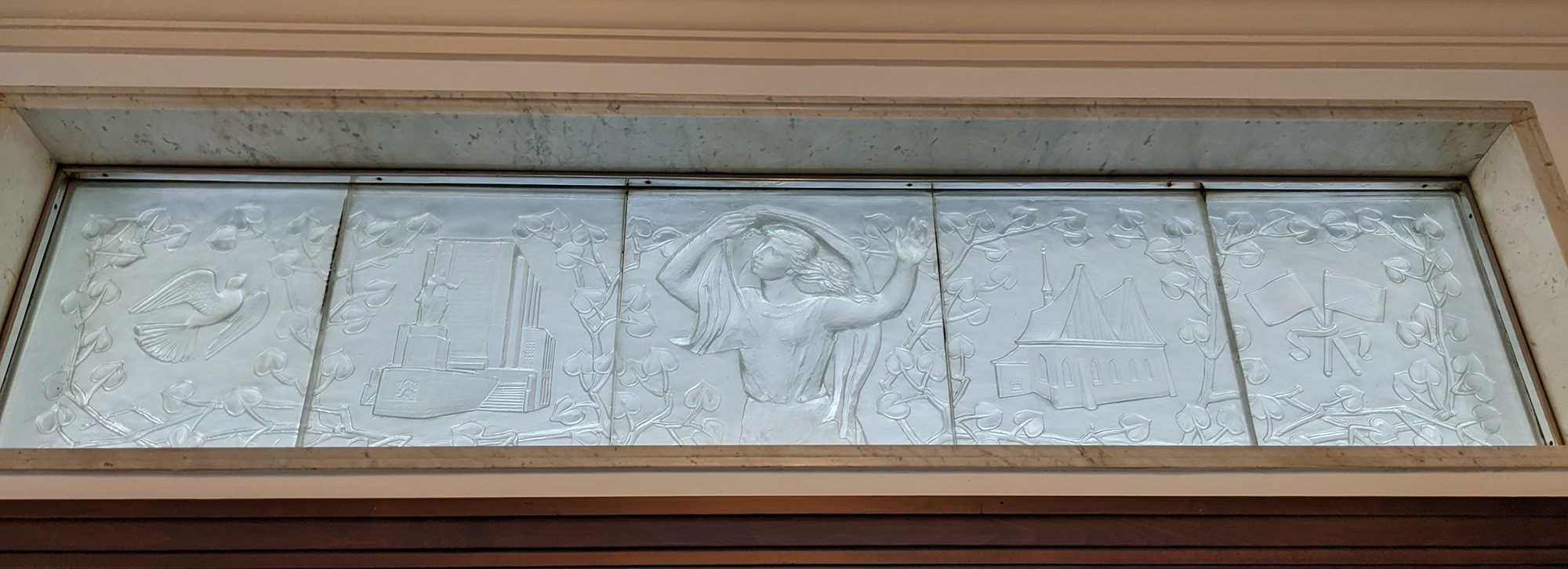 Skleněný panel s lipovými ratolestmi, 50. léta 20. století, zakázka Ministerstva obrany ČSR.