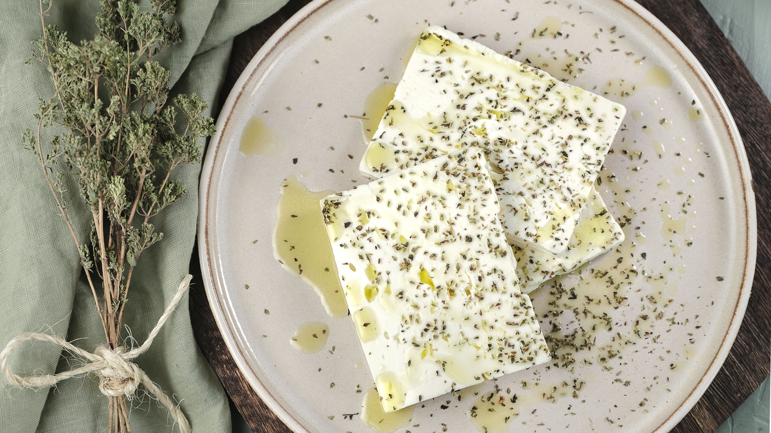 Oregano a extra panenský olivový olej na sýru feta