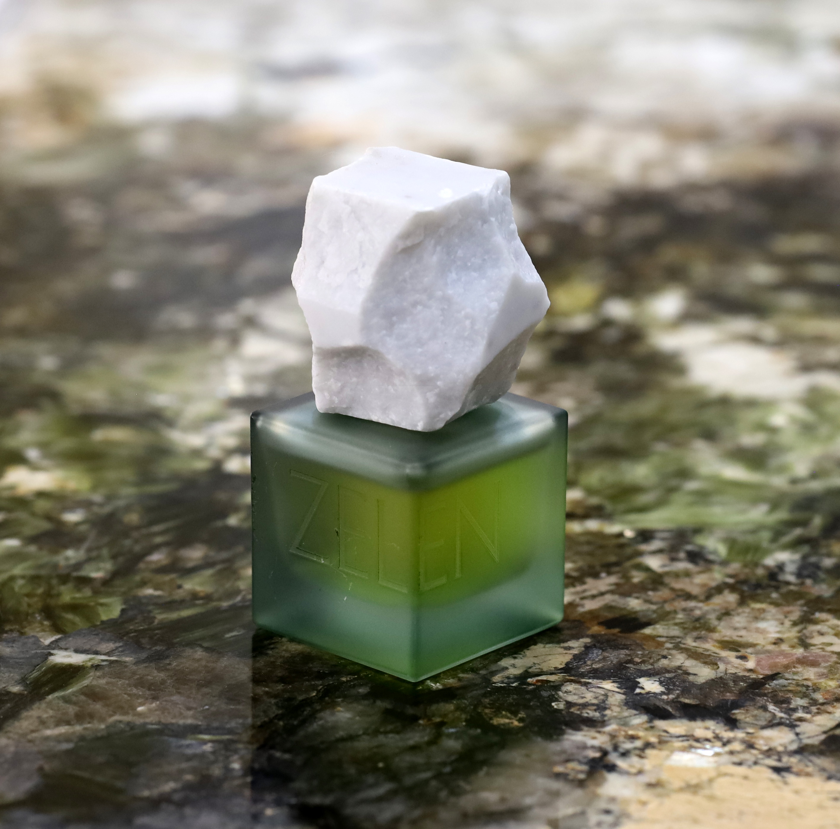 Vynořuje se ještě jedna asociace — jadeit. Ne smaragd, ne malachit, ne demantoid ani verdelit, ale právě jadeit. Jeho tlumený, něžný odstín odráží měkkost a vyrovnanost vůně, zatímco jeho vláknitá struktura — jemné proplétání tremolitu a aktinolitu — zrcadlí způsob, jakým se v receptuře Zelenu proplétají noty a akordy. Myslím na předměty vyřezané z tohoto minerálu — vázy, misky, drobné sošky — okouzlující, hmatatelné kousky, které najdete v obchodech se suvenýry a v řemeslných buticích. Ráda se na ně dívám a držím je v rukou — ten kámen má na mě nezaměnitelně uklidňující účinek. Zátka Zelen je z mramoru, ale já bych ji udělala z jadeitu.
