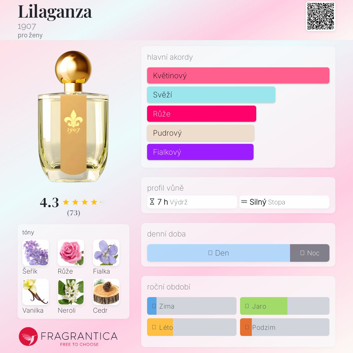 Lilaganza podle 1907 je Floral vůně pro ženy. Lilaganza byl/a uveden/a v roce 2022. Vrchní tón je Neroli ; střední tóny jsouŠeřík, Růže a Fialka ; základní tóny jsou Vanilka a Cedr.