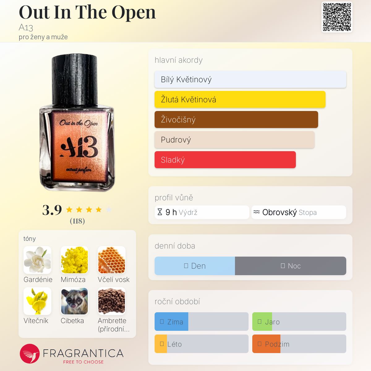 Out In The Open podle A13 je Floral Woody Musk vůně pro ženy a muže. Out In The Open byl/a uveden/a v roce 2021. "Nosem" za touto vůní je Miguel Matos. Vrchní tóny jsou Gardénie, Ambrette (přírodní pižmo), Šafrán a Jablko; střední tóny jsouMimóza, Janovec, Jasmín, Orris a Pomerančový květ ; základní tóny jsou Včelí vosk, Cibetka, Kůže, Fazole tonka, Vanilka a Santalové dřevo.
