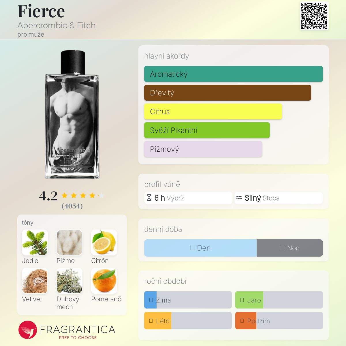 Fierce podle Abercrombie & Fitch je Woody Aromatic vůně pro muže. Fierce byl/a uveden/a v roce 2002. Fierce byl/a vytvořen/a Christophe Laudamiel a Bruno Jovanovic. Vrchní tóny jsou Jedle, Citrón, Pomeranč, Mořské tóny, Petitgrain a Kardamom; střední tóny jsouRozmarýn, Konvalinka, Jasmín, Šalvěj a Růže ; základní tóny jsou Pižmo, Vetiver, Dubový mech, Brazilské růžové dřevo a Santalové dřevo.
