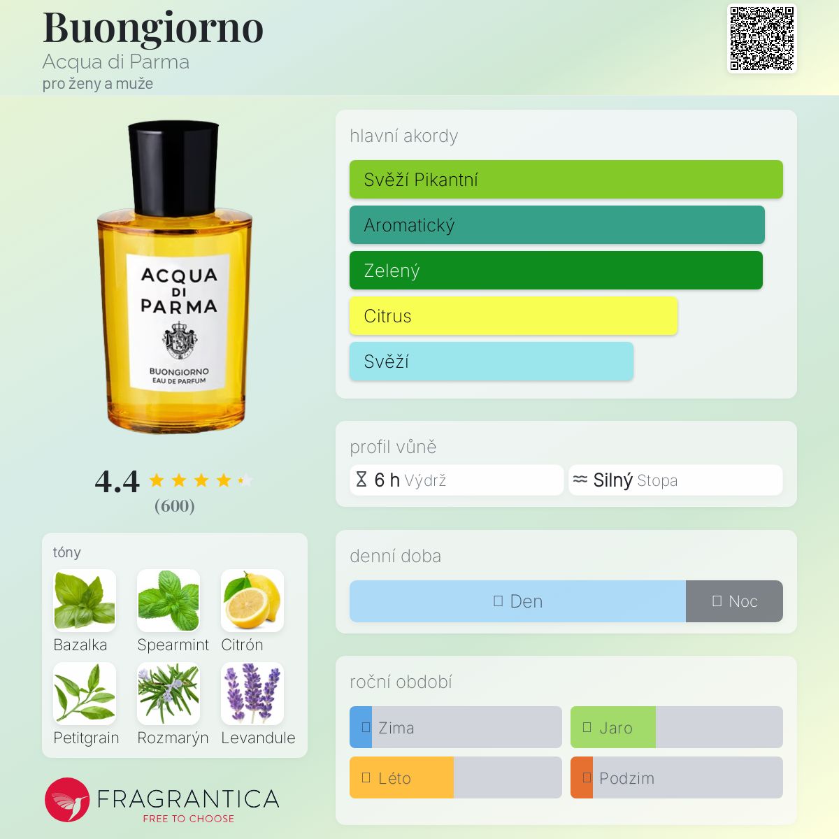 Buongiorno podle Acqua di Parma je Citrus Aromatic vůně pro ženy a muže. Toto je nová vůně. Buongiorno byl/a uveden/a v roce 2025. Vrchní tóny jsou Bazalka, Spearmint, Citrón, Petitgrain a Rozmarýn; střední tóny jsouMandarinkový list a Divoká levandule ; základní tóny jsou Bílé pižmo, Cedr a Jantar (ambra).