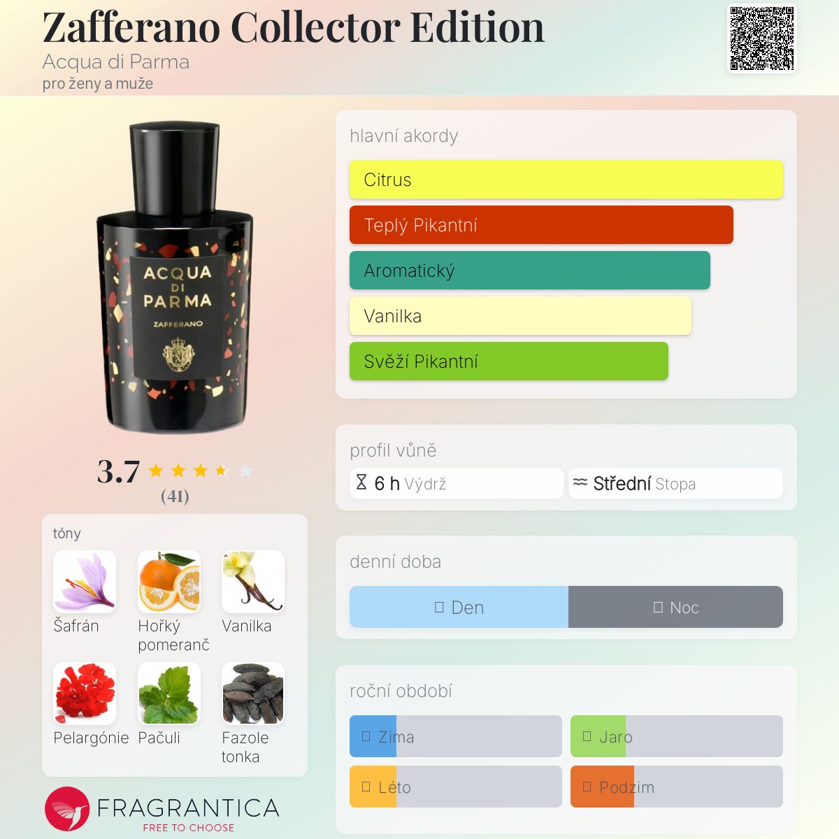 Zafferano Collector Edition podle Acqua di Parma je vůně pro ženy a muže. Zafferano Collector Edition byl/a uveden/a v roce 2023. Vrchní tóny jsou Hořký pomeranč, Koriandr, Bergamot a Mandarinka; střední tóny jsouŠafrán, Pelargónie, Pomerančový květ, Růže a Jasmín Sambac ; základní tóny jsou Vanilka, Pačuli a Fazole tonka.