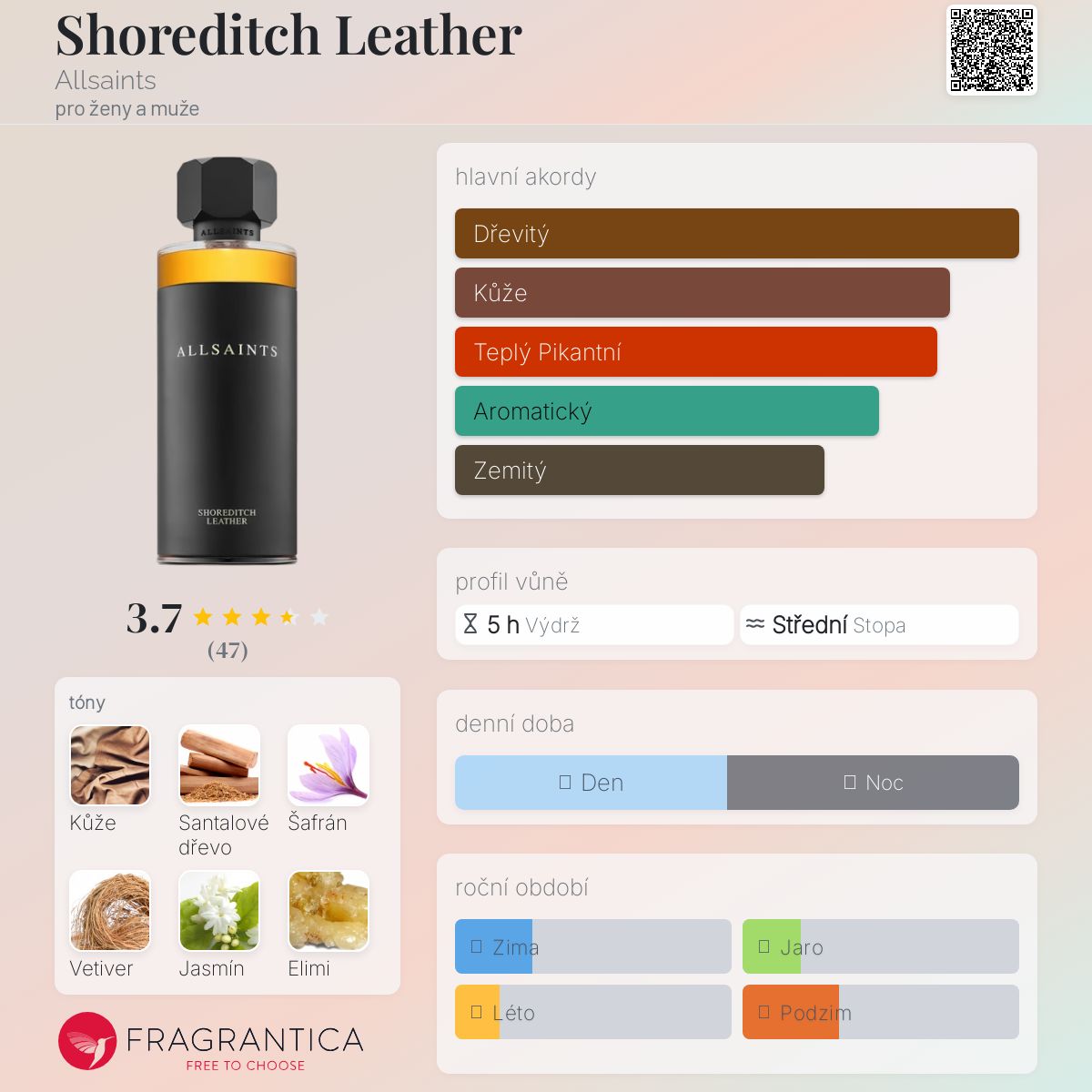 Shoreditch Leather podle Allsaints je Leather vůně pro ženy a muže. Toto je nová vůně. Shoreditch Leather byl/a uveden/a v roce 2024. "Nosem" za touto vůní je Gabriela Chelariu. Vrchní tóny jsou Šafrán, Elimi a Růže; střední tóny jsouKůže, Santalové dřevo a Jasmín ; základní tóny jsou Vetiver, Pačuli a Jantar (ambra).