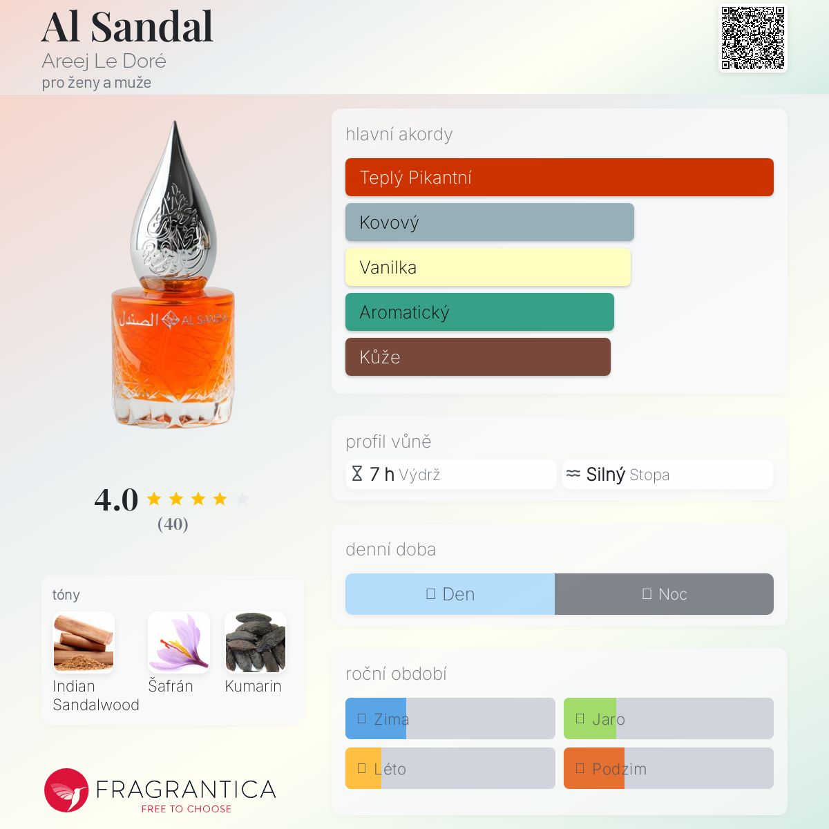 Al Sandal podle Areej Le Doré je Orientální Woody vůně pro ženy a muže. Toto je nová vůně. Al Sandal byl/a uveden/a v roce 2024. "Nosem" za touto vůní je Russian Adam. Vrchní tón je Šafrán ; střední tóny jsouIndian Sandalwood a Kumarin ; základní tón je Indian Sandalwood.
