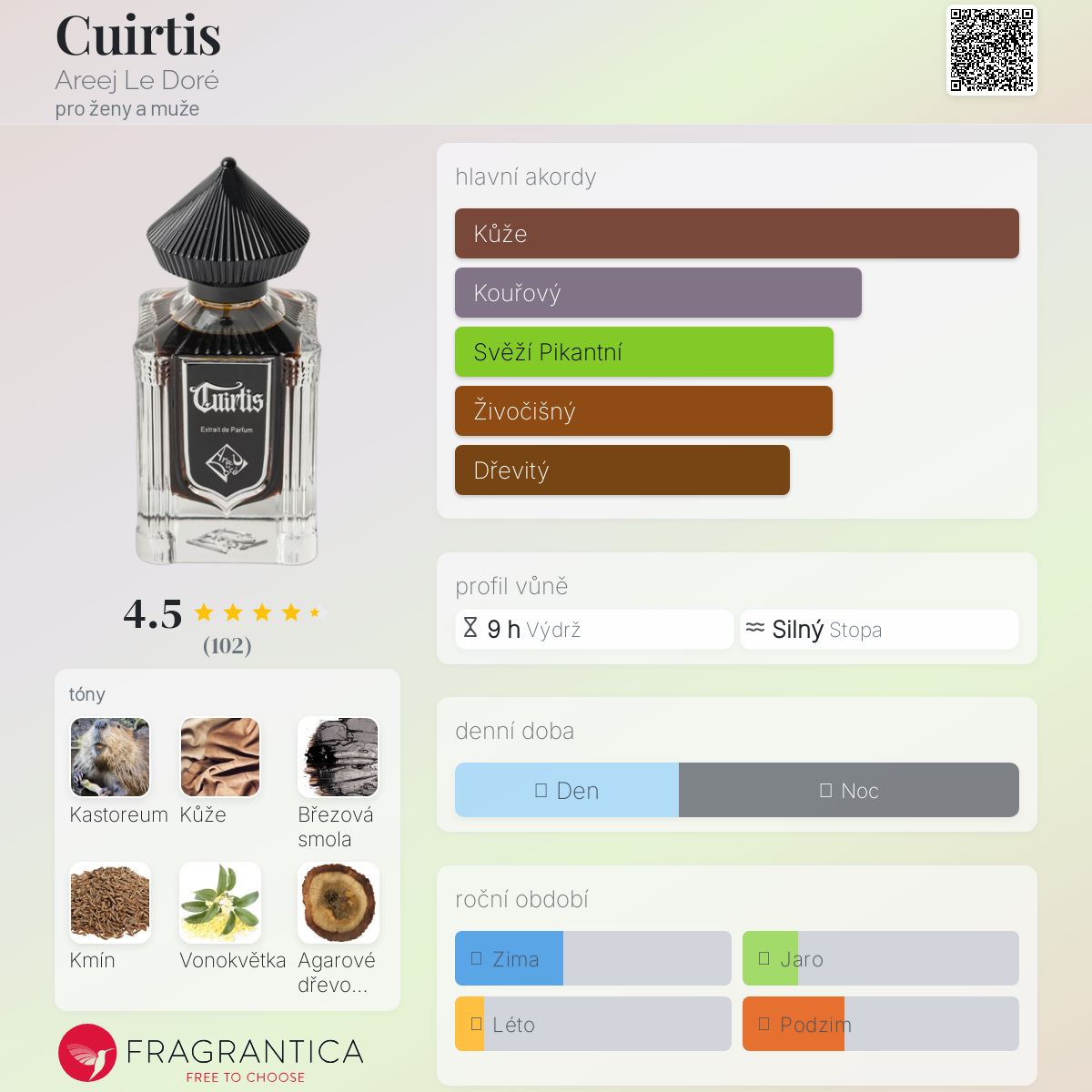 Cuirtis podle Areej Le Doré je Leather vůně pro ženy a muže. Toto je nová vůně. Cuirtis byl/a uveden/a v roce 2024. "Nosem" za touto vůní je Russian Adam. Vrchní tóny jsou Kastoreum, Kmín, Vonokvětka a Jalovcové bobulky; střední tóny jsouKastoreum, Březová smola, Orris, Vanilka, Pelargónie a Růže ; základní tóny jsou Kastoreum, Ruská kůže, Agarové dřevo (oud), Fialkový list a Dubový mech.