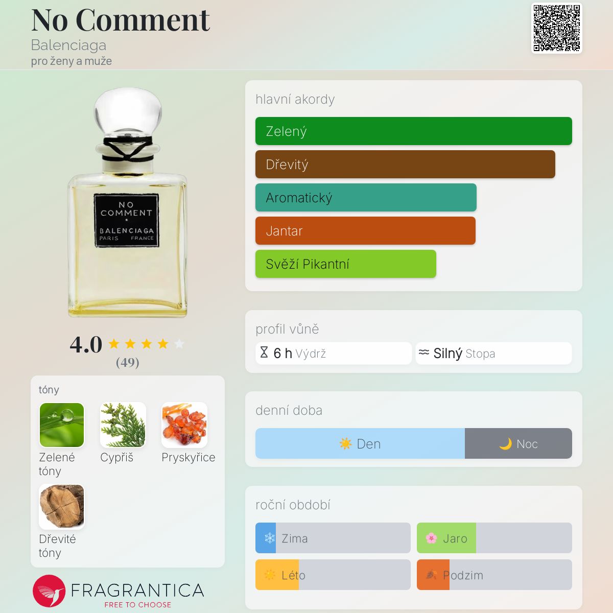 No Comment podle Balenciaga je Woody vůně pro ženy a muže. Toto je nová vůně. No Comment byl/a uveden/a v roce 2025. Vrchní tón je Zelené tóny ; střední tón jeCypřiš ; základní tóny jsou Pryskyřice a Dřevité tóny.