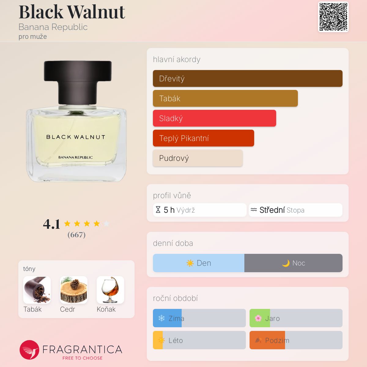 Black Walnut podle Banana Republic je Woody Aromatic vůně pro muže. Black Walnut byl/a uveden/a v roce 2006. "Nosem" za touto vůní je Harry Fremont. Vrchní tón je Koňak ; střední tón jeTabák ; základní tón je Virginský cedr. Tento parfém je vítězem oceněníFiFi Award Fragrance Of The Year Men`s Private Label/Direct Sell 2007 .