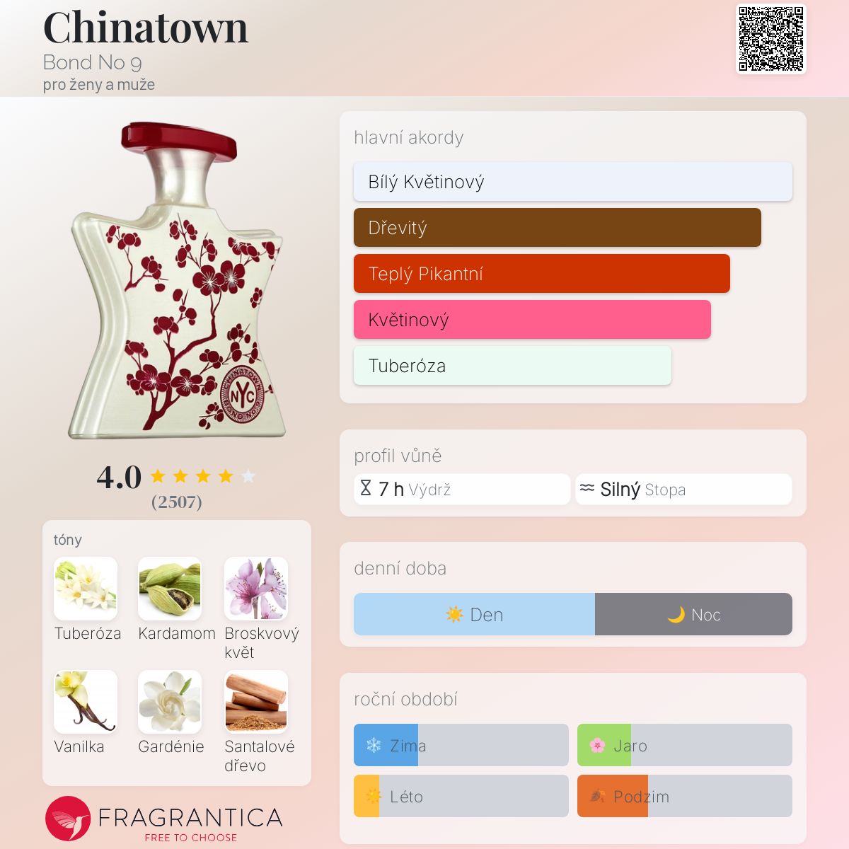 Chinatown podle Bond No 9 je Orientální Floral vůně pro ženy a muže. Chinatown byl/a uveden/a v roce 2005. "Nosem" za touto vůní je Aurélien Guichard. Vrchní tóny jsou Broskvový květ a Bergamot; střední tóny jsouTuberóza, Gardénie, Pomerančový květ a Pivoňka ; základní tóny jsou Kardamom, Vanilka, Santalové dřevo, Guajakové dřevo, Pačuli a Virginský cedr.