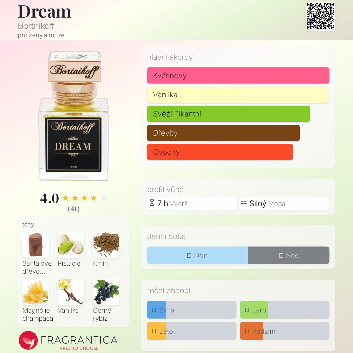 Dream podle Bortnikoff je Orientální Floral vůně pro ženy a muže. Dream byl/a uveden/a v roce 2023. "Nosem" za touto vůní je Dmitry Bortnikoff. Vrchní tóny jsou Santalové dřevo Mysore a Magnólie champaca; střední tóny jsouPistácie a Černý rybíz ; základní tóny jsou Kmín, Vanilka a Benzoin.