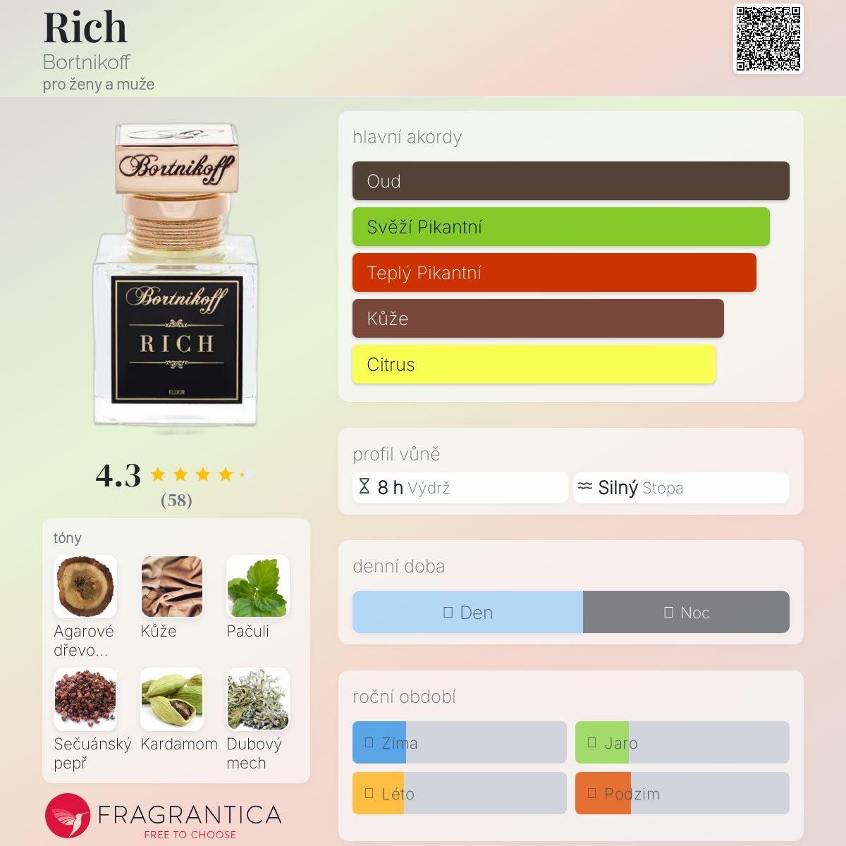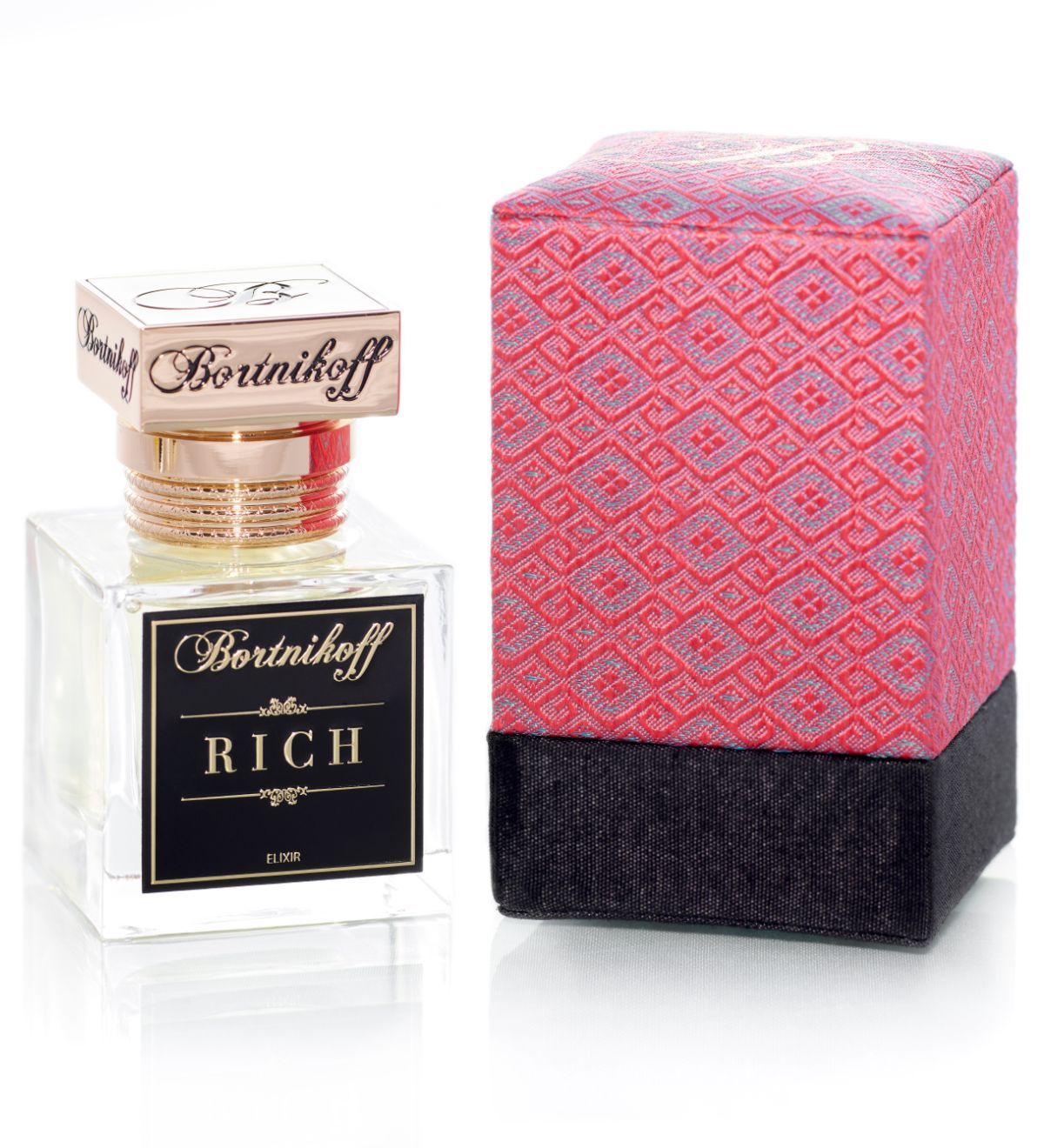 Rich podle Bortnikoff je Woody Floral Musk vůně pro ženy a muže. Rich byl/a uveden/a v roce 2023. "Nosem" za touto vůní je Dmitry Bortnikoff. Vrchní tóny jsou Sečuánský pepř, Bergamot a Kardamom; střední tóny jsouAgarové dřevo (oud), Pačuli a Jasmín ; základní tóny jsou Kůže, Dubový mech, Vetiver a Jantar (ambra).