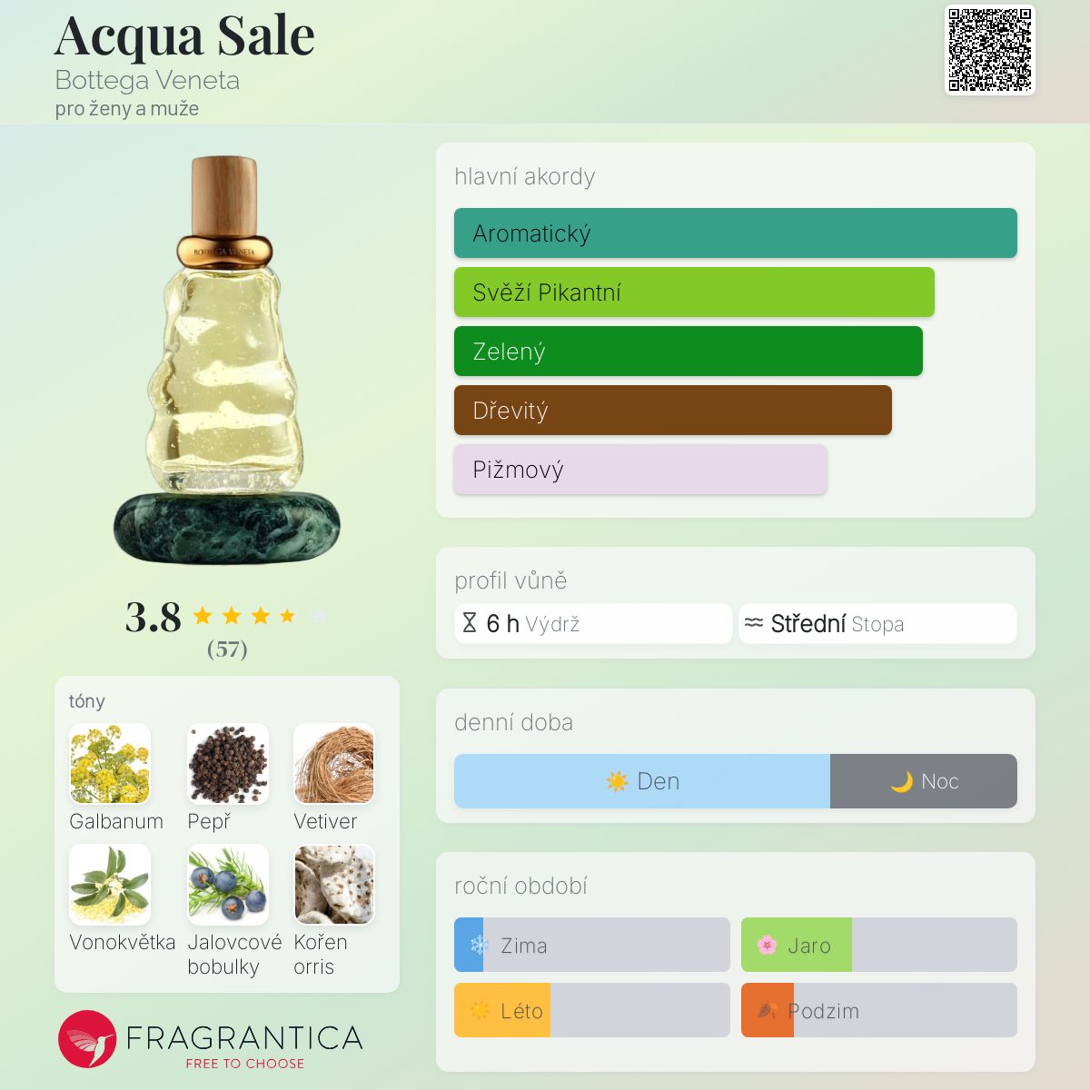 Acqua Sale podle Bottega Veneta je Woody Aquatic vůně pro ženy a muže. Toto je nová vůně. Acqua Sale byl/a uveden/a v roce 2024. Vrchní tóny jsou Černý pepř, Jalovcové bobulky a Mandarinka; střední tóny jsouGalbanum, Vonokvětka, Orris a Mořská sůl ; základní tóny jsou Vetiver, Pižmo a Španělské labdanum.