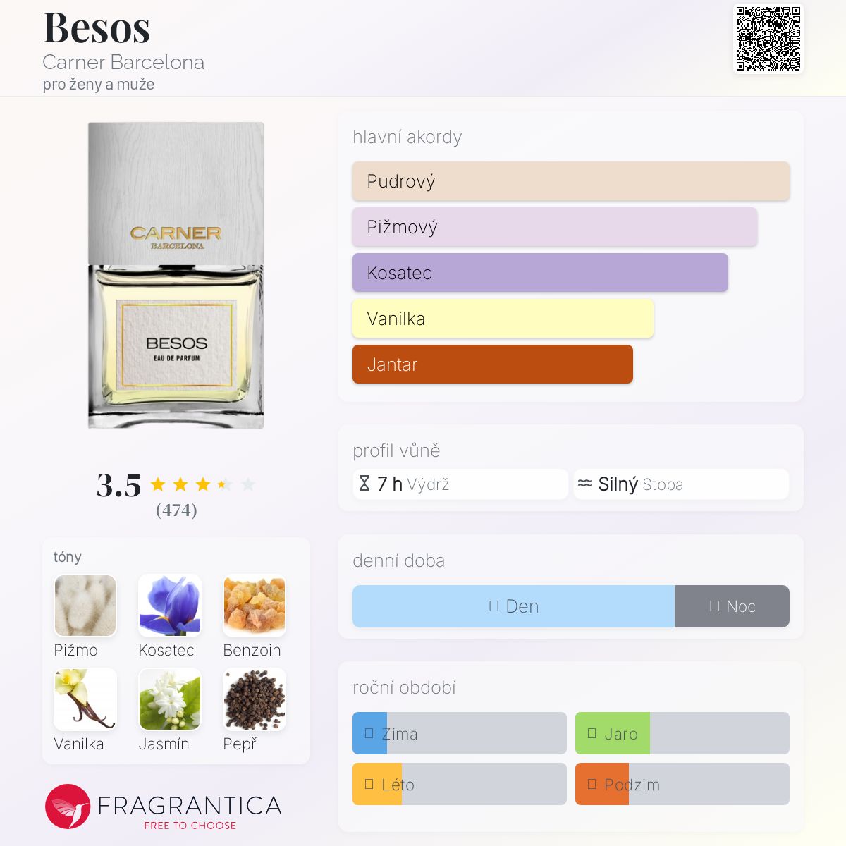 Besos podle Carner Barcelona je Floral vůně pro ženy a muže. Besos byl/a uveden/a v roce 2017. "Nosem" za touto vůní je Shyamala Maisondieu. Vrchní tóny jsou Madagaskarský pepř a Italská mandarinka; střední tóny jsouKosatec a Jasmín Sambac ; základní tóny jsou Pižmo, Benzoin a Vanilka.