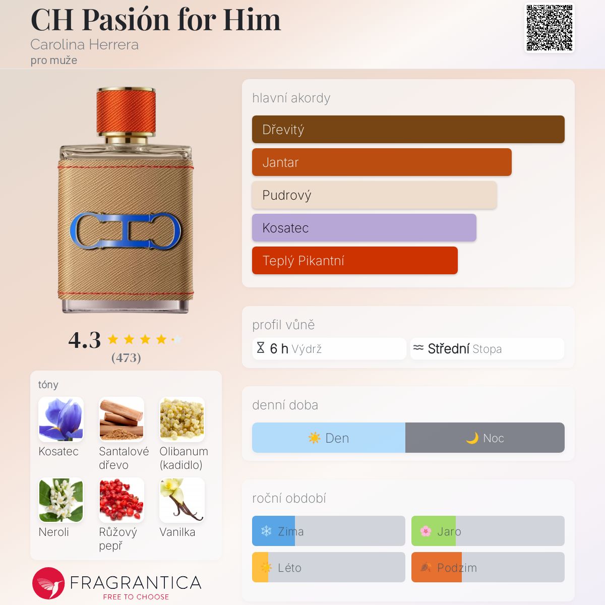 CH Pasión for Him od značky Carolina Herrera, uvedená na trh v roce 2023, je obklopující, sofistikovaná a vášnivá vůně. Její svrchní tóny odhalují jedinečnou fúzi olibanum, neroli a růžového pepře, která je v úvodu podmanivá a tajemná. V srdci se prolínají kosatec, myrha a cedr, které dodávají kompozici vůně hloubku a eleganci.