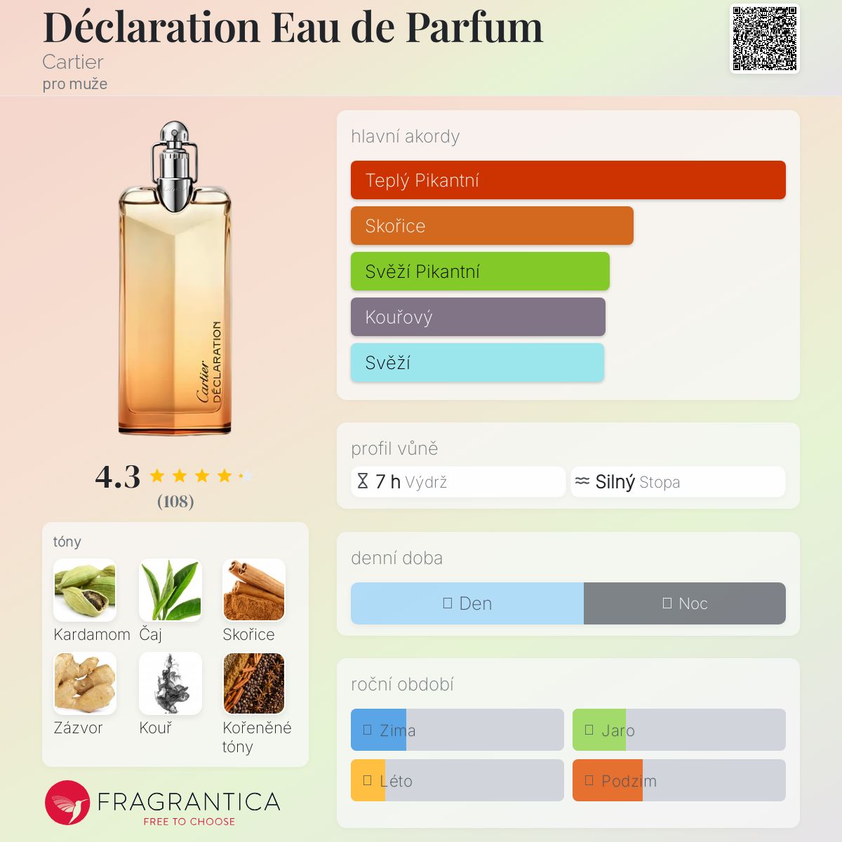 Déclaration Eau de Parfum podle Cartier je Aromatic Spicy vůně pro muže. Toto je nová vůně. Déclaration Eau de Parfum byl/a uveden/a v roce 2024. Vrchní tóny jsou Kardamom, Skořice a Zázvor; střední tóny jsouČaj a Kouř ; základní tón je Koření.